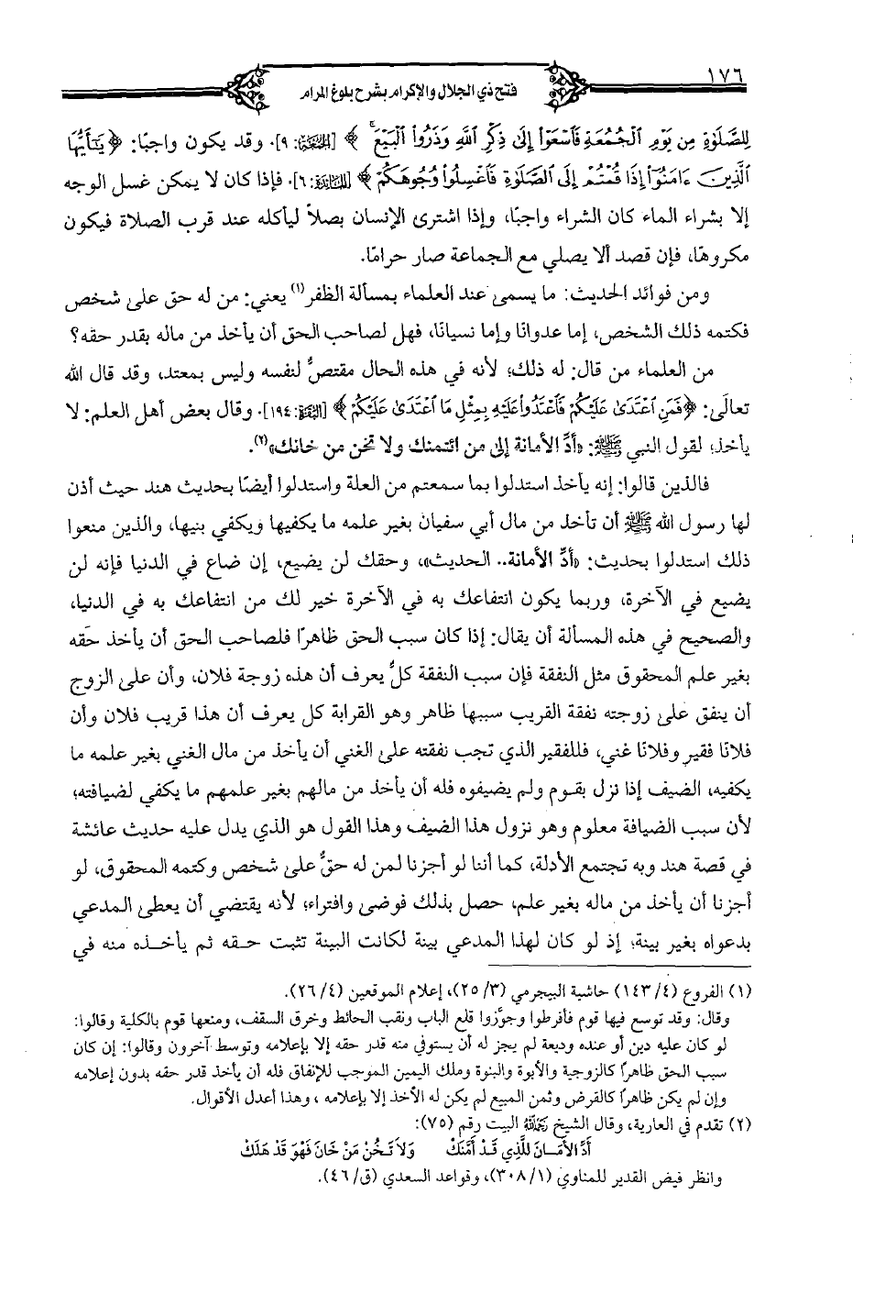 فالذين قالوا: إنه يأخذ استدلوا بما سمعتم من العلة واستدلوا أيضًا بحديث هند حيث أذن لها رسول الله صلى الله عليه وسلم أن تأخذ من مال أبي سفيان بغير علمه ما يكفيها ويكفي بنيها، والذين منعوا ذلك استدلوا بحديث: "أد الأمانة .. الحديث"، وحقك لن يضيع، إن ضاع في الدنيا فإنه لن يضيع في الآخرة، وربما يكون انتفاعك به في الآخرة خير لك من انتفاعك به في الدنيا، والصحيح في هذه المسألة أن يقال: إذا كان سبب الحق ظاهرًا فلصاحب الحق أن يأخذ حقه بغير علم المحقوق مثل النفقة فإن سبب النفقة كل يعرف أن هذه زوجة فلان، وأن على الزوج أن ينفق على زوجته نفقة القريب سببها ظاهر وهو القرابة كل يعرف أن هذا قريب فلان وأن فلانا فقير وفلانًا غني، فللفقير الذي تجب نفقته على الغني أن يأخذ من مال الغني بغير علمه ما يكفيه، الضيف إذا نزل بقوم ولم يضيفوه فله أن يأخذ من مالهم بغير علمهم ما يكفي لضيافته؛ لأن سبب الضيافة معلوم وهو نزول هذا الضيف وهذا القول هو الذي يدل عليه حديث عائشة في قصة هند وبه تجتمع الأدلة، كما أننا لو أجزنا لمن له حق على شخص وكتمه المحقوق، لو أجزنا أن يأخذ من ماله بغير علم، حصل بذلك فوضى وافتراء؛ لأنه يقتضي أن يعطى المدعي بدعواه بغير بينة؛ إذ لو كان لهذا المدعي بينة لكانت البينة تثبت حقه ثم يأخذه منه في