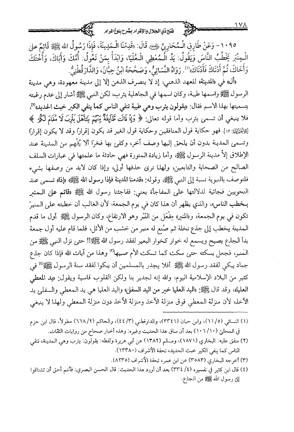 "أل" في "المدينة" للعهد الذهني؛ إذ لا ينصرف الذهن إلا إلى مدينة معهودة، وهي مدينة الرسول صلى الله عليه وسلم واسمها طيبة، وكان اسمها في الجاهلية يثرب، لكن النبي صلى الله عليه وسلم أشار إلى عدم رغبته بتسميتها بهذا الاسم فقال: "يقولون يثرب وهي طيبة تنفي الناس كما ينفي الكير خبث الحديد"، فلا ينبغي أن تسمى يثرب وأما قوله تعالى: (وإذ قالت طائفة منهم يا أهل يثرب لا مقام لكم) [الأحزاب: 13]. فهو حكاية قول المنافقين وحكاية قول الغير قد يكون إقرارًا وقد لا يكون إقرارًا وتسمى المدينة بدون أن يلحق إليها وصف آخر، وكفى بها فخرًا ألا يفهم من المدينة عند الإطلاق إلا مدينة الرسول صلى الله عليه وسلم، وأما زيادة المنورة فهي حادثة ما علمتها في عبارات السلف الصالح من الصحابة والتابعين، ولهذا نرى حذفها أولى، وإذا كان لابد من وصفها بشيء فلتوصف بالنبوية نسبة إلى النبي صلى الله عليه وسلم، وقوله: "قدمنا المدينة فإذا رسول الله صلى الله عليه وسلم" "إذا" تسمى عند النحويين فجائية لدلالتها على المفاجأة يعني: ففاجئنا رسول الله صلى الله عليه وسلم "قائم على المنبر بخطب الناس"، والذي يظهر أن هذا كان في يوم الجمعة؛ لأن الغالب أن خطبته على المنبر تكون في يوم الجمعة، و"المنبر" مفعل من النبر وهو الارتفاع، وكان الرسول صلى الله عليه وسلم أول ما قدم المدينة يخطب إلى جدع نخلة ثم صنع له منبر من خشب من الأئل، فلما قام عليه أول جمعة بدأ الجدع يصيح ويسمع له خوار كخوار البعير لفقد رسول الله صلى الله عليه وسلم! ! حتى نزل النبي صلى الله عليه وسلم من المنبر، فجعل يسكته حتى سكت كما تسكت الأم صبيها وهذا من آيات الله فإذا كان جدع جماد يبكي لفقد رسول الله صلى الله عليه وسلم أفلا يجدر بالمسلمين أن يبكوا لفقد سنة الرسول صلى الله عليه وسلم في كثير من البلاد الإسلامية اليوم، والله إنه لجدير بنا ولكن القلوب قاسية ويقول: "يد المعطي العليا"، وقد قال صلى الله عليه وسلم: "اليد العليا خير من اليد السفلى" واليد العليا هي يد المعطي والسفلى يد الآخذ؛ لأن منزلة المعطي فوق منزلة الآخذ ومنزلة الآخذ دون منزلة المعطي ولهذا لا ينبغي