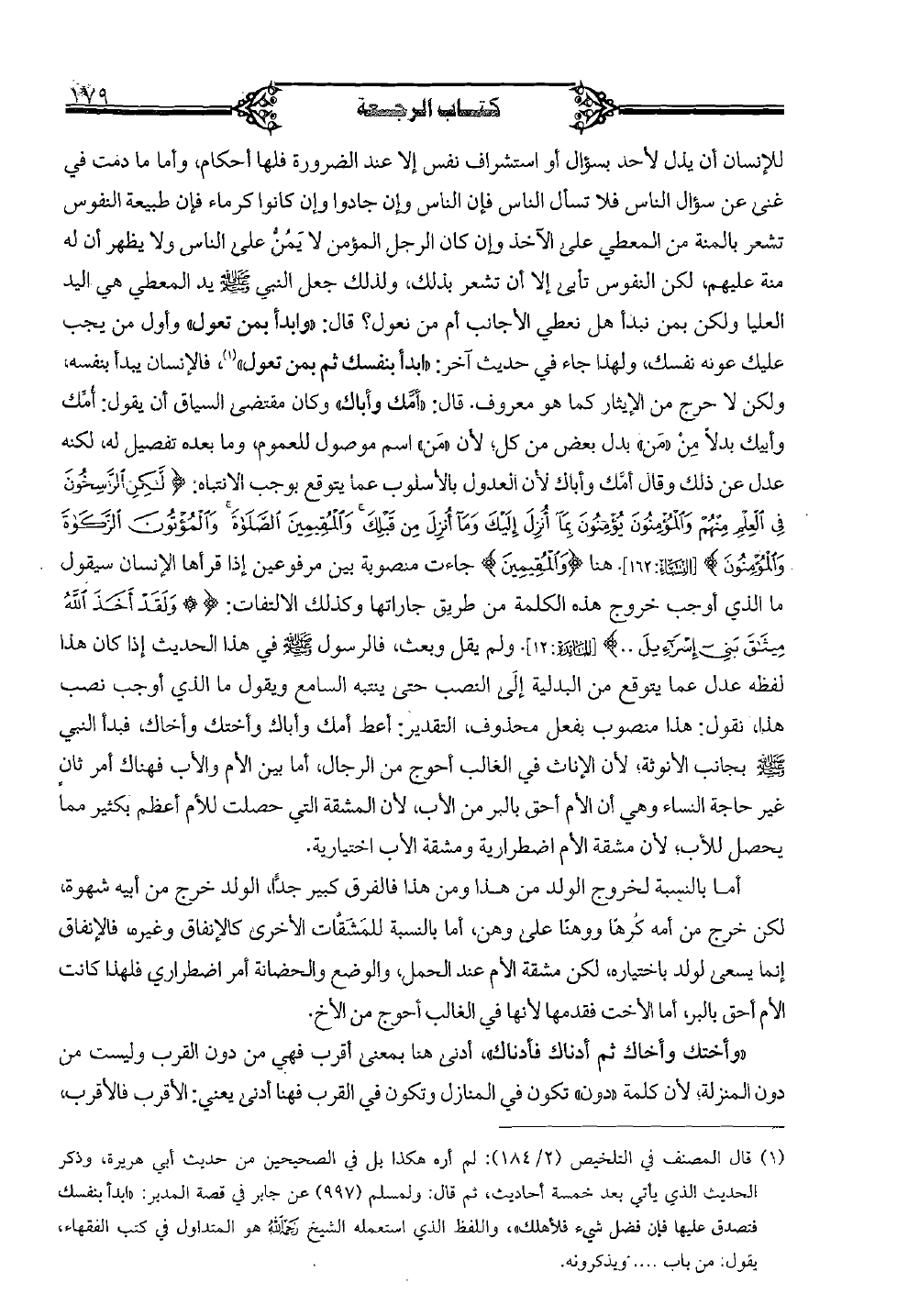 للإنسان أن يدل لأحد بسؤال أو استشراف نفس إلا عند الضرورة فلها أحكام، وأما ما دمت في غنى عن سؤال الناس فلا تسأل الناس فإن الناس وإن جادوا وإن كانوا كرماء فإن طبيعة النفوس تشعر بالمنة من المعطي على الآخذ وإن كان الرجل المؤمن لا يمن على الناس ولا يظهر أن له منه عليهم، لكن النفوس تأبى إلا أن تشعر بذلك، ولذلك جعل النبي صلى الله عليه وسلم يد المعطي هي اليد العليا ولكن بمن نبدأ هل نعطي الأجانب أم من نعول؟ قال: "وابدأ بمن تعول" وأول من يجب عليك عونه نفسك، ولهذا جاء في حديث آخر: "ابدأ بنفسك ثم بمن تعول"، فالإنسان يبدأ بنفسه، ولكن لا حرج من الإيثار كما هو معروف. قال: "أمك وأباك" وكان مقتضى السياق أن يقول: أمك وأبيك بدلًا من "من" بدل بعض من كل؛ لأن "من" اسم موصول للعموم، وما بعده تفصيل له، لكنه عدل عن ذلك وقال أمك وأباك لأن العدول بالأسلوب عما يتوقع بوجب الانتباه: (لكن الراسخون في العلم منهم والمؤمنون يؤمنون بما أنزل إليك وما أنزل من قبلك والمقيمين الصلوة والمؤتون الزكوة والمؤمنون) [النساء: 162]. هنا (والمقيمين) جاءت منصوبة بين مرفوعين إذا قرأها الإنسان سيقول ما الذي أوجب خروج هذه الكلمة من طريق جاراتها وكذلك الالتفات: (ولقد أخذ الله ميثاق بنى إسراءيل .. ) [المائدة: 12]. ولم يقل وبعث، فالرسول صلى الله عليه وسلم في هذا الحديث إذا كان هذا لفظه عدل عما يتوقع من البدلية إلى النصب حتى ينتبه السامع ويقول ما الذي أوجب نصب هذا، نقول: هذا منصوب بفعل محذوف، التقدير: أعط أمك وأباك وأختك وأخاك، فبدأ النبي صلى الله عليه وسلم بجانب الأنوثة؛ لأن الإناث في الغالب أحوج من الرجال، أما بين الأم والأب فهناك أمر ثان غير حاجة النساء وهي أن الأم أحق بالبر من الأب، لأن المشقة التي حصلت للأم أعظم بكثير مما يحصل للأب؛ لأن مشقة الأم اضطرارية ومشقة الأب اختيارية.