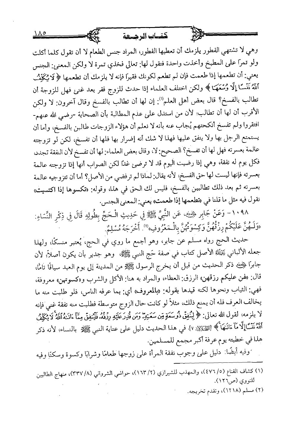 حديث الحج رواه مسلم عن جابر، وهو أجمع ما روي في الحج، يعتبر منسكًا، ولهذا جعله الألباني رحمه الله الأصل كتاب في صفة حج النبي صلى الله عليه وسلم، وهو جدير بأن يكون أصلًا؛ لأن جابرًا رضي الله عنه ذكر الحديث من قبل أن يخرج الرسول صلى الله عليه وسلم من المدينة إلى يوم العيد سياقًا تامًا، قال: "لهن عليكم رزقهن" الرزق: العطاء، والمراد به هنا: الأكل والشرب و"كسوتهن" معروفة، فهي: الثياب ونحوها لكنه قيدها بقوله: "بالمعروف" أي: بما عرفه الناس، فلو طلبت منه ما يخالف العرف فله أن يمنع ذلك، مثلًا لو كانت حال الزوج متوسطة فطلبت منه نفقة غني فإنه لا يلزمه؛ لقول الله تعالى: (لينفق ذو سعة من سعته ومن قدر عليه رزقه فلينفق مما ءاتاه الله لا يكلف الله نفسًا إلا ما ءاتاها) [الطلاق: 7]. في هذا الحديث دليل على عناية النبي صلى الله عليه وسلم بالنساء؛ لأنه ذكر هذا في خطبته يوم عرفة أكبر مجمع للمسلمين.