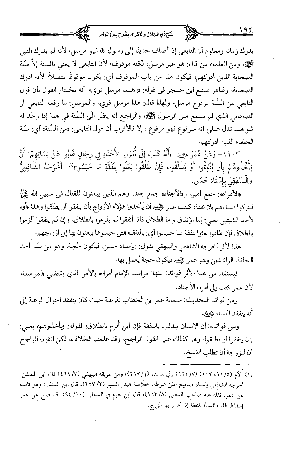 1103 - وعن عمر رضي الله عنه: "أنه كتب إلى أمراء الأجناد في رجال غابوا عن نسائهم: أن يأخذوهم بأن ينفقوا أو يطلقوا، فإن طلقوا بعثوا بنفقة ما حبسوا". أخرجه الشافعي والبيهقي بإسناد حسن.