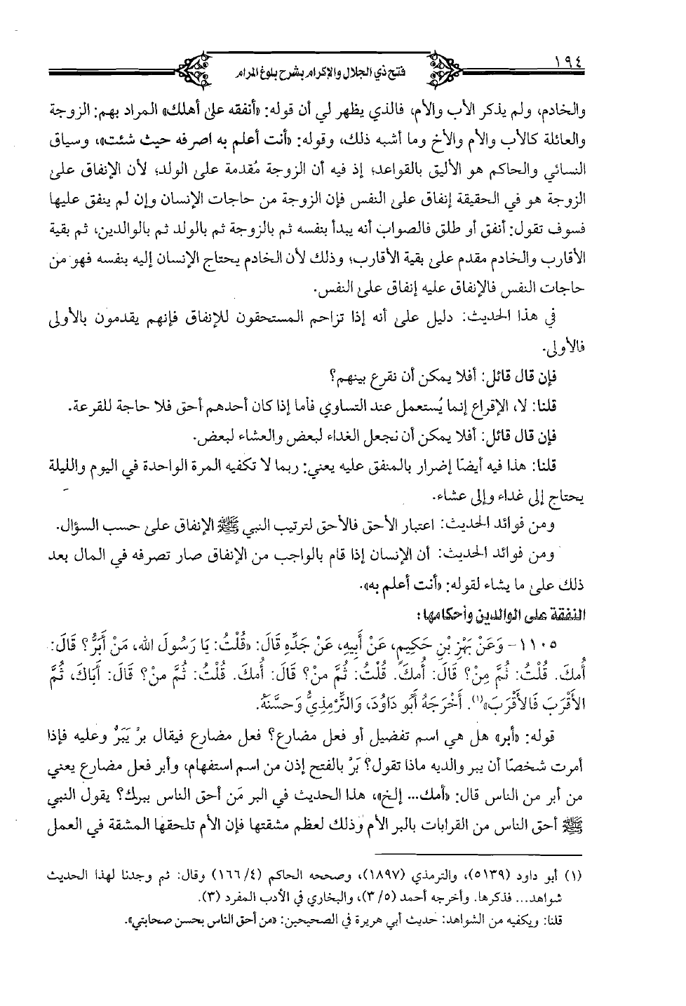 والخادم، ولم يذكر الأب والأم، فالذي يظهر لي أن قوله: "أنفقته على أهلك" المراد بهم: الزوجة والعائلة كالأب والأم والأخ وما أشبه ذلك، وقوله: "أنت أعلم به اصرفه حيث شئت"، وسياق النسائي والحاكم هو الأليق بالقواعد؛ إذ فيه أن الزوجة مقدمة على الولد، لأن الإنفاق على الزوجة هو في الحقيقة إنفاق على النفس فإن الزوجة من حاجات الإنسان وإن لم ينفق عليها فسوف تقول: أنفق أو طلق فالصواب أنه يبدأ بنفسه ثم الزوجة ثم بالولد ثم بالوالدين، ثم بقية الأقارب والخادم مدم على بقية الأقارب؛ وذلك لأن الخادم يحتاج الإنسان إليه بنفسه فهو من حاجات النفس فالإنفاق عليه إنفاق على النفس.