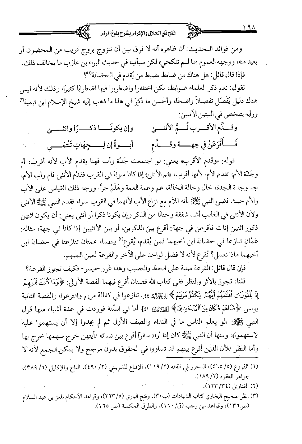 قوله: "وقدم الأقرب" يعني: لو اجتمعت جدة وأب فهنا يقدم الأب لأنه أقرب، أم وجدة الأم، تقدم الأم، لأنها أقرب، "ثم الأنثى" إذا كانا سواء في القرب فقدم الأنثى فأم وأب الأم، جد وجدة الجدة، خال وخالة الخالة، عم وعمة العمة وهلم جرا، ووجه ذلك القياس على الأب والأم حيث قضى النبي صلى الله عليه وسلم بأنه للأم مع نزاع الأب لأنهما في القرب سواء فقدم النبي صلى الله عليه وسلم الأنثى ولأن الأنثى في الغالب أشد شفقة وحنانا من الذكر وإن يكونا ذكرا أو أنثى يعني: أن يكون اثنين ذكور اثنين إناث فأقرعن في جهة: أقرع بين الذكرين، أو بين الأنثيين إذا كانا في جهة، مثاله: عمان تنازعا في الحضانة ابن أخيهما فمن يقدم، يقرع بينهما، عمتان تنازعتا في الحضانة ابن أخيهما ما نعمل؟ نقرع لأنه لا فضل لواحد على الآخر والقرعة تعين المبهم.