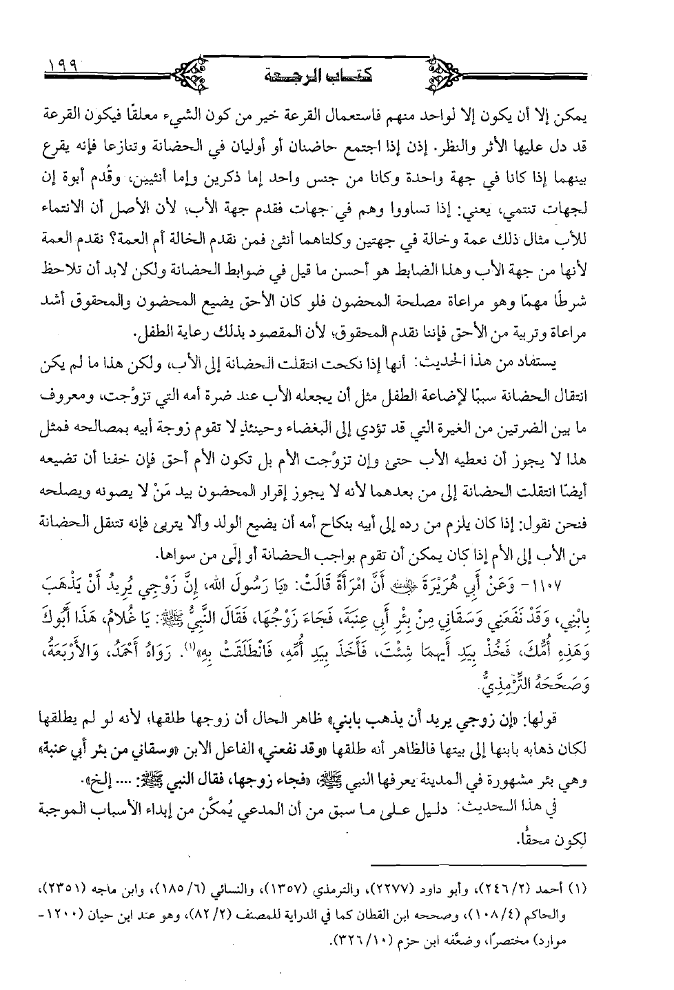 1107 - وعن أبي هريرة رضي الله عنه أن امرأة قالت: "يا رسول الله، إن زوجي يريد أن يذهب بابني، وقد نفعني وسقاني من بئر أبي عنبة، فجاء زوجها، فقال النبي صلى الله عليه وسلم: يا غلام، هذا أبوك وهذه أمك، فخذ بيد أيهما شئت، فأخذ بيد أمه، فانطلقت به". رواه أحمد، والأربعة، وصححه الترمذي.