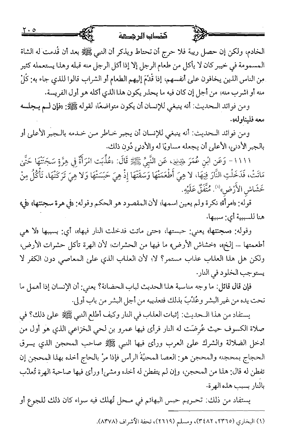 وقوله: "سجنتها" يعني: حبستها, "حتى ماتت فدخلت النار فيها", أي: بسببها "لا هي أطعمتها ... الخ", "خشاش الأرض" ما فيها من الحشرات لأن الهرة تأكل حشرات الأرض, ولكن هذا العذاب عذاب مستمر؟ لا؛ لأن العذاب الذي على المعاصي دون الكفر لا يستوجب الخلود في النار.