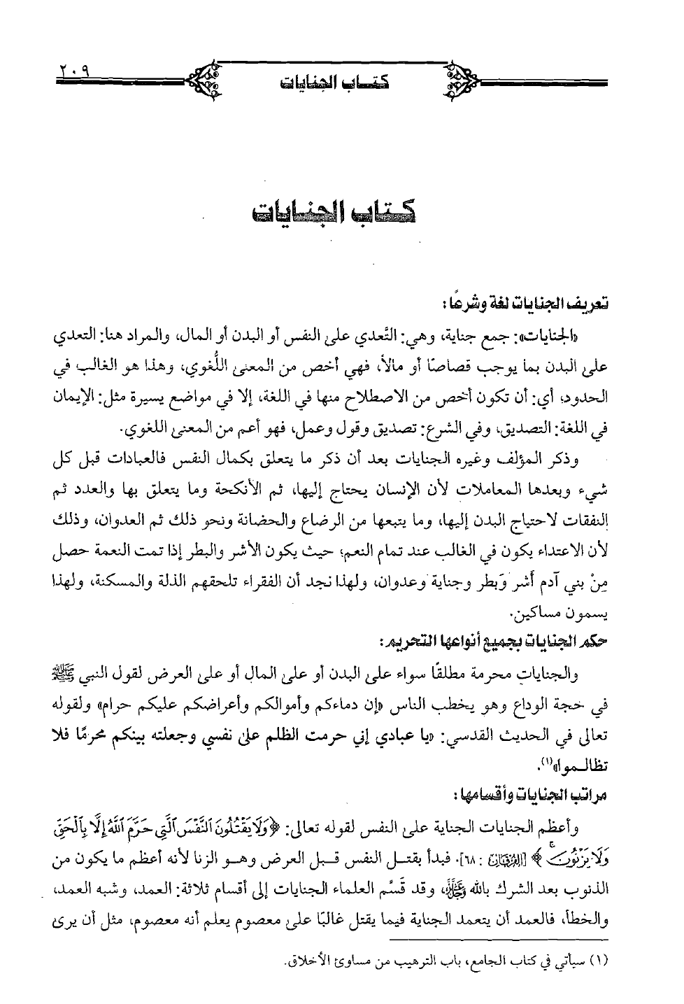 وذكر المؤلف وغيره الجنايات بعد أن ذكر ما يتعلق بكمال النفس فالعبادات قبل كل شيء وبعدها المعاملات لأن الإنسان يحتاج إليها، ثم الأنكحة وما يتعلق بها والعدد ثم النفقات لاحتياج البدن إليها، وما يتبعها من الرضاع والحضانة ونحو ذلك ثم العدوان، وذلك لأن الاعتداء يكون في الغالب عند تمام النعم، حيث يكون الأشر والبطر إذا تمت النعمة حصل من بني آدم أشر وبطر وجناية وعدوان، ولهذا نجد أن الفقراء تلحقهم الذلة والمسكنة، ولهذا يسمون مساكين.