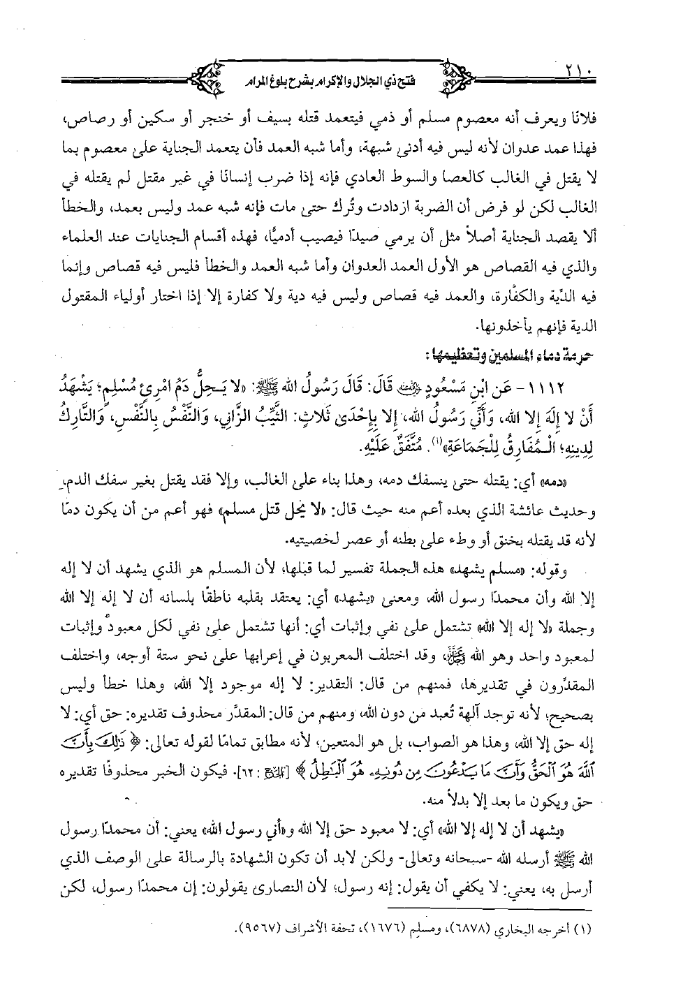 1112 - عن ابن مسعود رضي الله عنه قال: قال رسول الله صلي الله عليه وسلم: "لا يحلُّ دمُ أمريء مُسلم بشهدُ أن لا إله إلا الله، وأنًي رسول الله، إلا بإحدى ثلاثٍ: الثيب الزاني، والنفس بالنفس، والتارك لدينه، والمفارق للجماعة". متفق عليه.
