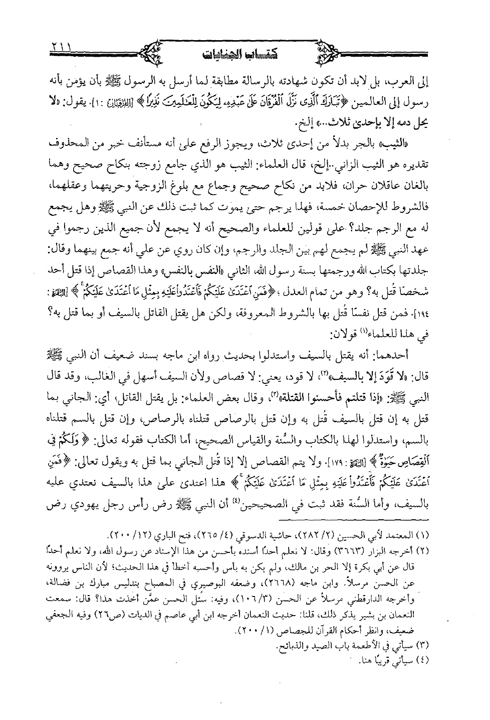 "الثيب" بالجر بدلًا من إحدى ثلاث، ويجوز الرفع على أنه مستأنف خبر من المحذوف تقديره هو الثيب الزاني .. إلخ، قال العلماء: الثيب هو الذي جامع زوجته بنكاح صحيح وهما بالغان عاقلان حران، فلابد من نكاح صحيح وجماع من بلوغ الزوجية وحريتهما وعقلهما، فالشروط للإحصان خمسة، فهذا يرجم حتى يموت كما ثبت ذلك عن النبي صلي الله عليه وسلم وهل يجمع له من الرجم جلد؟ على قولين للعلماء والصحيح أنه لا يجمع لأن جميع الذين رجعوا في عهد النبي صلي الله عليه وسلم لم يجمع لهم بين الجلد والرجم، وإن كان روي عن علي أنه جمع بينهما وقال: جلدتها بكتاب الله ورجمتها بسنة رسول الله، الثاني "النفس بالنفس" وهذا القصاص إذا قتل أحد شخصًا قتل به؟ وهو من تمام العدل، ? فمن اعتدى عليكم فاعتدوا عليه بمثل ما اعتدى عليكم? [البقرة: 194]. فمن قتل بها بالشروط المعروفة، ولكن هل يقتل القاتل بالسيف أو ما قتل به؟ في هذا للعلماء قولان:
