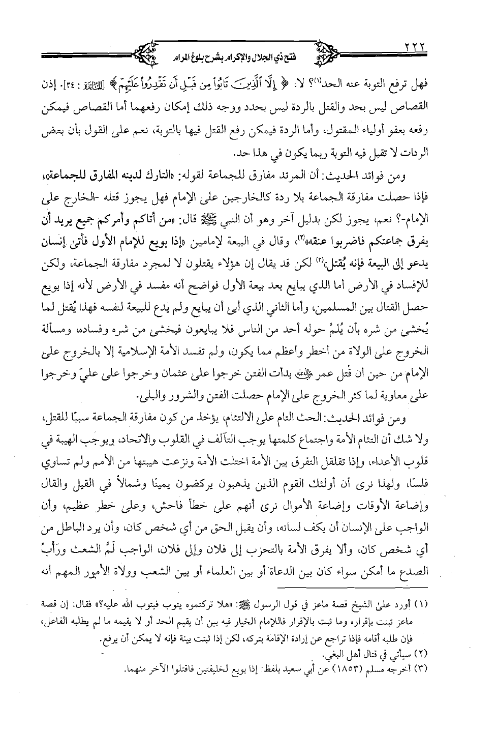 ومن فوائد الحديث: أن المرتد مفارق للجماعة لقوله: "التارك لدينه المفارق للجماعة" فإذا حصلت مفارقة الجماعة بلا ردة كالخارجين على الإمام فهل يجوز قتله - الخارج على الإمام -؟ نعم؟ يجوز لكن بدليل آخر وهو أن النبي صلى الله عليه وسلم قال: "من أتاكم وأمركم جميع تريد أن يفرق جماعتكم فاضربوا عنقه"، وقال في البيعة لإمامين "إذا بويع للإمام الأول فأتى إنسان يدعو إلى البيعة فإنه يقتل" لكن قد يقال إن هؤلاء يقتلون لا لمجرد مفارقة الجماعة، ولكن للإفساد في الأرض أما الذي يبايع بعد بيعة الأول فواضح أنه مفسد في الأرض لأنه إذا بويع حصل القتال بين المسلمين، وأما الثاني الذي أبى أن يبايع ولم يدع للبيعة لنفسه فهذا يقتل لما يخشى من شره بأن يلم حوله أحد من الناس فلا يبايعون فيخشى من شره وفساده، ومسألة الخروج على الولاة من أخطر وأعظم مما يكون، ولم تفسد الأمة الإسلامية إلا بالخروج على الإمام من حيث أن قتل عمر رضى الله عنه بدأت الفتن خرجوا على عثمان وخرجوا على عليّ وخرجوا على معاوية لما كثر الخروج على الإمام حصلت الفتن والشرور والبلى.