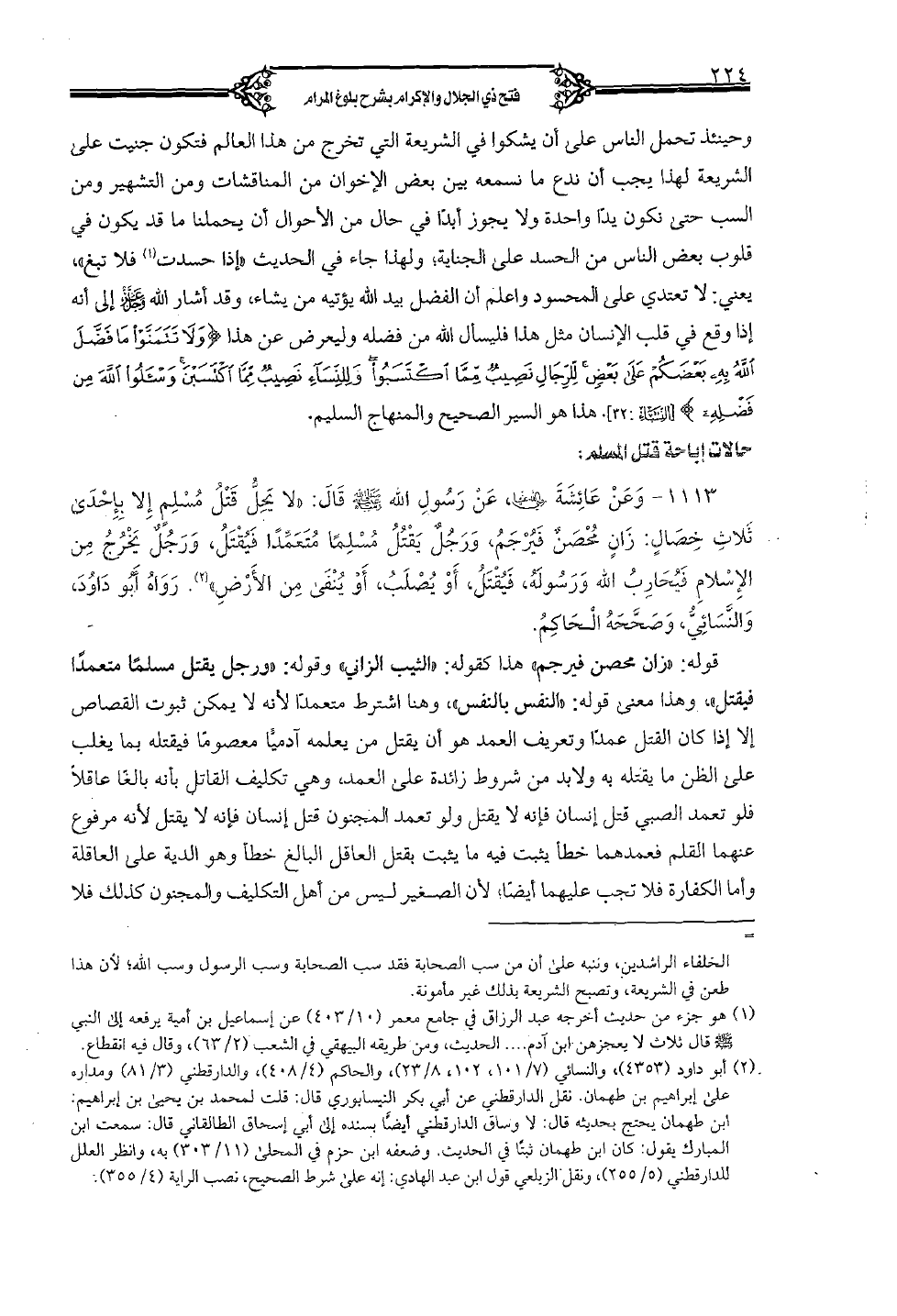 1113 - وعن عائشة رضى الله عنها عن رسول الله صلى الله عليه وسلم قال: "لا يحل قتل مسلم إلا بإحدى ثلاث خصال: زانٍ محصن فيرجم، ورجل يقتل مسلمًا متعمِّدًا فيقتل، ورجلٌ يخرج من الإسلام فيحارب الله ورسوله، فيقتل، أو يصلب، أو ينفى من الأرض". رواه أبو داود، والنسائيُّ وصحَّحه الحاكم.