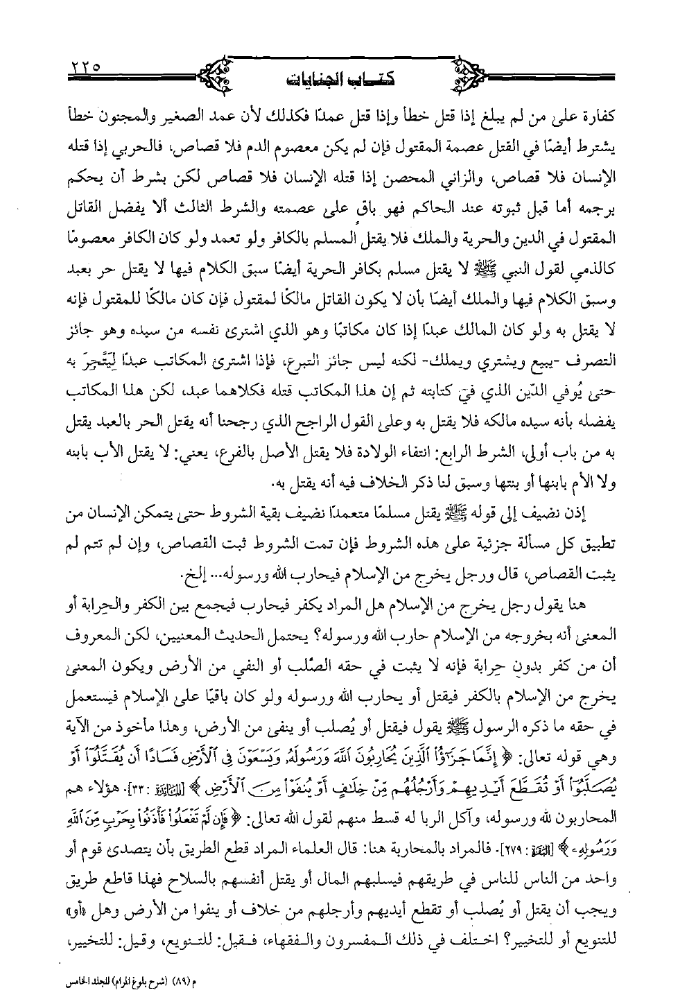 كفارة على من لم يبلغ إذا قتل خطأ وإذا قتل عمدًا فكذلك لأن عمد الصغير والمجنون خطأ يشترط أيضًا في القتل عصمة المقتول فإن لم يكن معصوم الدم فلا قصاص، فالحربي إذا قتله الإنسان فلا قصاص، والزاني المحصن إذا قتله الإنسان فلا قصاص لكن بشرط أن يحكم برجمه أما قبل ثبوته عند الحاكم فهو باقٍ على عصمته والشرط الثالث ألا يفضل القاتل المقتول في الدين والحرية والملك فلا يقتل المسلم بالكافر ولو تعمد ولو كان الكافر معصومًا كالذمي لقول النبي صلى الله عليه وسلم لا يقتل مسلم بكافر الحرية أيضًا سبق الكلام فيها لا يقتل حر بعبد وسبق الكلام فيها والملك أيضًا بأن لا يكون القاتل مالكًا لمقتول فإن كان مالكًا للمقتول فإنه لا يقتل به ولو كان المالك عبدًا إذا كان مكاتبًا وهو الذي اشترى نفسه من سيده وهو جائز التصرف - يبيع ويشتري ويملك - لكنه ليس جائز التبرع، فإذا اشترك المكاتب عبدًا ليتَّجر به حتى يوفي الدّين الذي في كتابته ثم إن هذا المكاتب قتله فكلاهما عبد، لكن هذا المكاتب يفضله بأنه سيده مالكه فلا يقتل به وعلى القول الراجح الذي رجحنا أنه يقتل الحر بالعبد يقتل به من باب أولى، الشرط الرابع: انتفاء الولادة فلا يقتل الأصل بالفرع، يعني: لا يقتل الأب بابنه ولا الأم بابنها أو بنتها وسبق لنا ذكر الخلاف فيه أنه يقتل به.