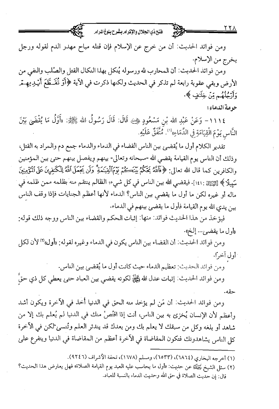 1114 - وعن عبد الله بن مسعوٍد رضي الله عنه قال: قال رسول الله صلى الله عليه وسلم: "أوَّل ما يقضى بين النَّاس يوم القيامة في الدِّماء". متَّفق عليه.