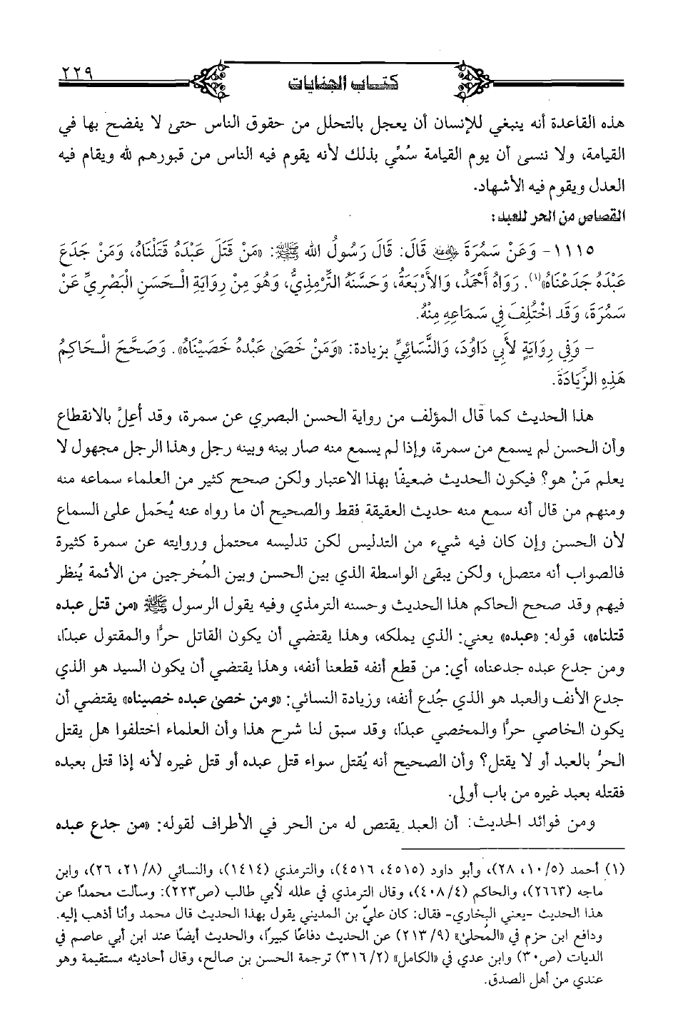هذا الحديث كما قال المؤلف من رواية الحسن البصري عن سمرة، وقد أعلَّ بالانقطاع وأن الحسن لم يسمع من سمرة، وإذا لم يسمع منه صار بينه وبينه رجل وهذا الرجل مجهول لا يعلم من هو؟ فيكون الحديث ضعيفًا بهذا الاعتبار ولكن صحح كثير من العلماء سماعه منه ومنهم من قال أنه سمع منه حديث العقيقة فقط والصحيح أن ما رواه عنه يحمل على السماع لأن الحسن وإن كان فيه شيء من التدليس لكن تدليسه محتمل وروايته عن سمرة كثيرة فالصواب أنه متصل، ولكن يبقى الواسطة الذي بين الحسن وبين المخرجين من الأئمة ينظر فيهم وقد صحح الحاكم هذا الحديث وحسنه الترمذي وفيه يقول الرسول صلى الله عليه وسلم "من قتل عبده قتلناه" قوله: "عبده" يعني: الذي يملكه، وهذا يقتضي أن يكون القاتل حرًا والمقتول عبدًا، ومن جدع عبده جدعناه، أي: من قطع أنفه قطعنا أنفه، وهذا يقتضي أن يكون السيد هو الذي جدع الأنف والعبد هو الذي جدع أنفه، وزيادة النسائي: "ومن خصى عبده خصيناه"يقتضي أن يكون الخاصي حرًا والمخصي عبدًا، وقد سبق لنا شرح هذا وأن العلماء اختلفوا هل يقتل الحرُّ بالعبد أو لا يقتل؟ وأن الصحيح أنه يقتل سواء قتل عبده أو قتل غيره لأنه إذا قتل بعبده فقتله بعبد غيره من باب أولى.