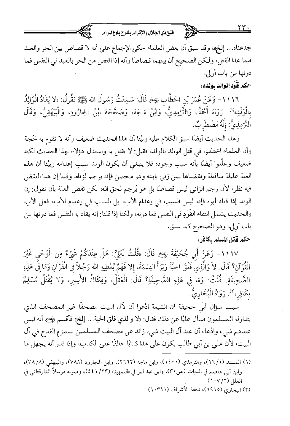 1116 - وعن عمر بن الخطَّاب رضي الله عنه قال: سمعت رسول الله صلى الله عليه وسلم يقول: "لا يقاد الوالد بالولد". رواه أحمد، والتِّرمذيُّ، وابن ماجه، وصحَّحه ابن الجارود، والبيهقيُّ، وقال التِّرمذيُّ: إنَّه مضطرٌب.