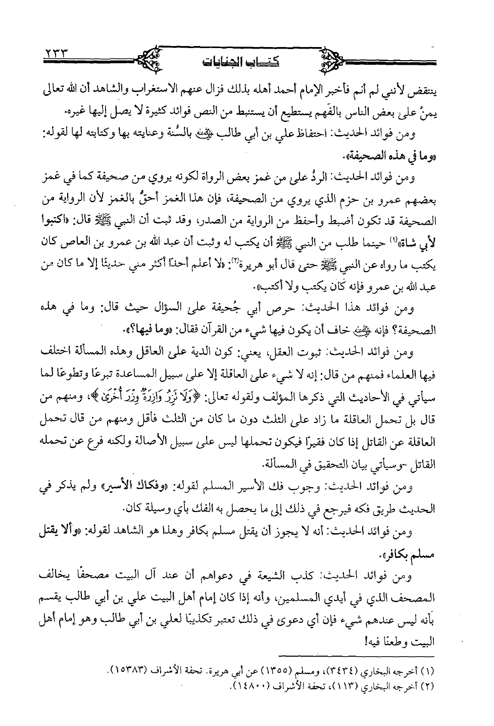 ومن فوائد الحديث: كذب الشيعة في دعواهم أن عند آل البيت مصحفًا يخالف المصحف الذي في أيدي المسلمين، وأنه إذا كان إمام أهل البيت علي بن أبي طالب يقسم بأنه ليس عندهم شيء فإن أي دعوى في ذلك تعتبر تكذيبًا لعلي بن أبي طالب وهو إمام أهل البيت وطعنًا فيه!