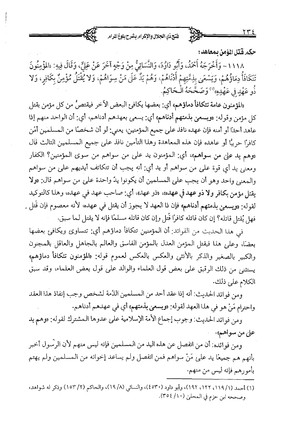 1118 - وأخرجه أحمد، وأبو داود، والنَّسائيُّ من وجٍه آخر عن عليٍّ، وقال فيه: "المؤمنون تتكافأ دماؤهم، ويسعى بذمَّتهم أدناهم، وهم يٌد عل من سواهم، ولا يقتل مؤمٌن بكافٍر، ولا ذو عهٍد في عهده" وصحَّحه الحاكم.