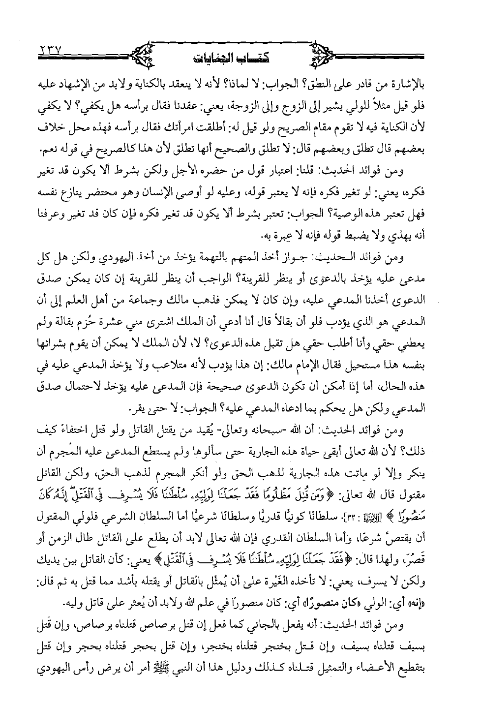 ومن فوائد الحديث: أن الله- سبحانه وتعالى- يقيد من يقتل القاتل ولو قتل اختفاء كيف ذلك؟ لأن الله تعالى أبقى حياة هذه الجارية حتى سألوها ولو يستطع المدعى عليه المجرم أن ينكر وإلا لو ماتت هذه الجارية لذهب الحق ولو أنكر المجرم لذهب الحق، ولكن القاتل مقتول قال الله تعالى: {ومن قتل مظلومًا فقد جعلنا لوليه سلطانًا فلا يسرف في القتل إنَّه كان منصورًا} [الإسراء: 33]. سلطانًا كونيًّا قدريًّا وسلطانًا شرعيًّا أما السلطان الشرعي فلولي المقتول أن يقتصَّ شرعًا، وأما السلطان القدري فإن الله تعالى لابد أن يطلع على القاتل طال الزمن أو قصر، ولهذا قال: {فقد جعلنا لوليّه سلطانًا فلا يسرف في القتل} يعني: كأن القاتل بين يديك ولكن لا يسرف، يعني: لا تأخذه الغيرة على أن يمثِّل بالقاتل أو يقتله بأشد مما قتل به ثم قال: "إنه" أي: الولي "كان منصورًا" أي: كان منصورًا في علم الله ولابد أن يعثر على قاتل وليه.