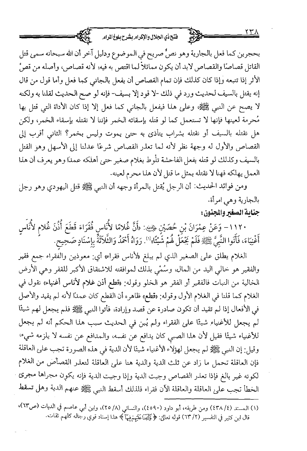1120 - وعن عمران بن حصين رضي الله عنه: "أنَّ غلامًا لأناس فقراء قطع أذن غلاٍم لأناٍس أغنياء، فأتوا النَّبيَّ صلى الله عليه وسلم فلم يجعل لهم شيئًا". رواه أحمد والثَّلاثة بإسناٍد صحيٍح.