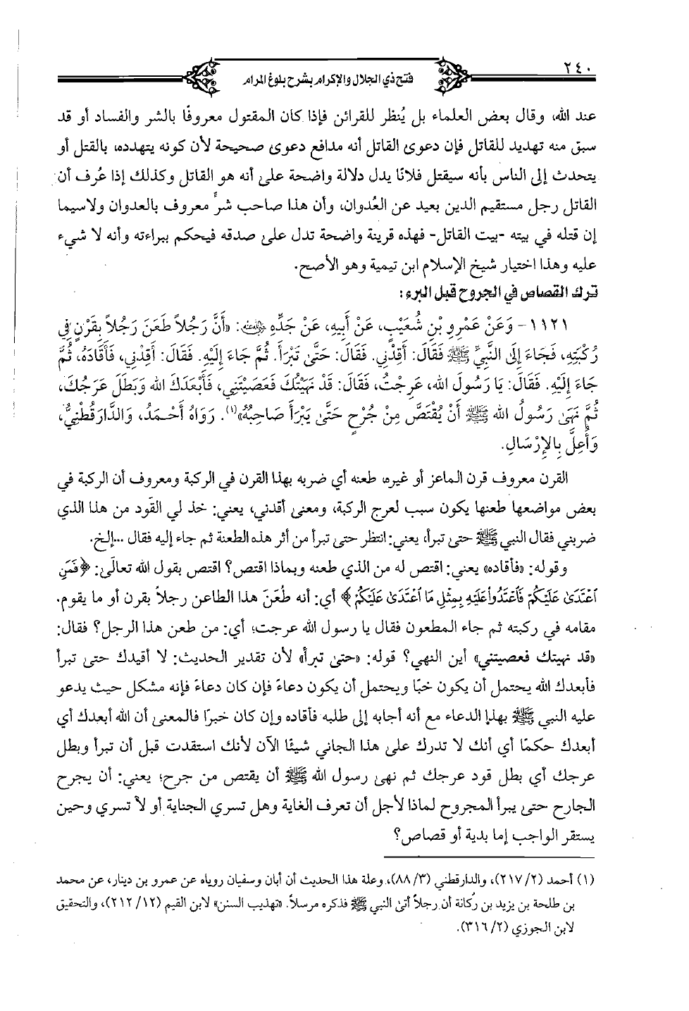 1121 - وعن عمرو بن شعيٍب، عن أبيه، عن جدِّه رضي الله عنه: "أنَّ رجلًا طعن رجلًا بقرٍن في ركبته، فجاء إلى النبي صلى الله عليه وسلم فقال: أقدني. فقال: حتَّى تبرأ. ثمَّ جاء إليه. فقال: أقدني، فأقاده، ثمَّ جاء إليه. فقال: يا رسول الله، عرجت، فقال: قد نهيتك فعصيتني، فأبعدك الله وبطل عرجك، ثم نهى رسول الله صلى الله عليه وسلم أن يقتصَّ من جرٍح حتَّى يبرأ صاحبه". رواه أحمد، والدَّارقطنيُّ، وأعلَّ بالإرسال.