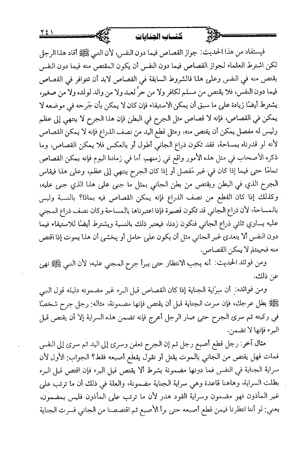 فيستفاد من هذا الحديث: جواز القصاص فيما دون النفس، لأن النبي صلى الله عليه وسلم أقاد هذا الرجل لكن اشترط العلماء لجواز القصاص فيما دون النفس أن يكون المقتص منه فيما دون النفس يقتص منه في النفس وعلى هذا فالشروط السابقة في القصاص لابد أن تتوافر في القصاص فيما دون النفس، فلا يقتص من مسلم لكافر ولا من حر لعبد ولا من والد لولده ولا من صغير، يشترط أيضًا زيادة على ما سبق أن يمكن الاستيفاء فإن كان لا يمكن بأن جرحه في موضعه لا يمكن في القصاص، فإنه لا قصاص مثل الجرح في البطن فإن هذا الجرح لا ينتهي إلى عظم وليس له مفصل يمكن أن يقتص منه، ومثل قطع اليد من نصف الذراع فإنه لا يمكن القصاص لأنه لو قدرناه بمساحة، فقد تكون ذراع الجاني أطول أو بالعكس فلا يمكن القصاص، وما ذكره الأصحاب في مثل هذه الأمور واقع في زمنهم، أما في زماننا اليوم فإنه يمكن القصاص تمامًا حتى فيما إذا كان في غير مفصل أو إذا كان الجرح ينتهي إلى عظم، وعلى فهذا فيقاس الجرح الذي في البطن ويقتص من بطن الجاني بمثل ما جنى على هذا الذي جنى عليه، وكذلك إذا كان القطع من نصف الذراع فإنه يمكن القصاص فيه بماذا؟ بالنسبة وليس بالمساحة؛ لأن ذراع الجاني قد تكون قصيرة فإذا اعتبرناها بالمساحة وكان نصف ذراع المجني عليه يساوي ثلثي ذراع الجاني فنكون زدنا، فيعتبر ذلك بالنسبة ويشترط أيضًا للاستيفاء فيما دون النفس ألا يتعدى غير الجاني مثل أن يكون على حامل أو يخشى أن هذا يموت إذا اقتص منه فحينئٍذ لا يمكن القصاص.