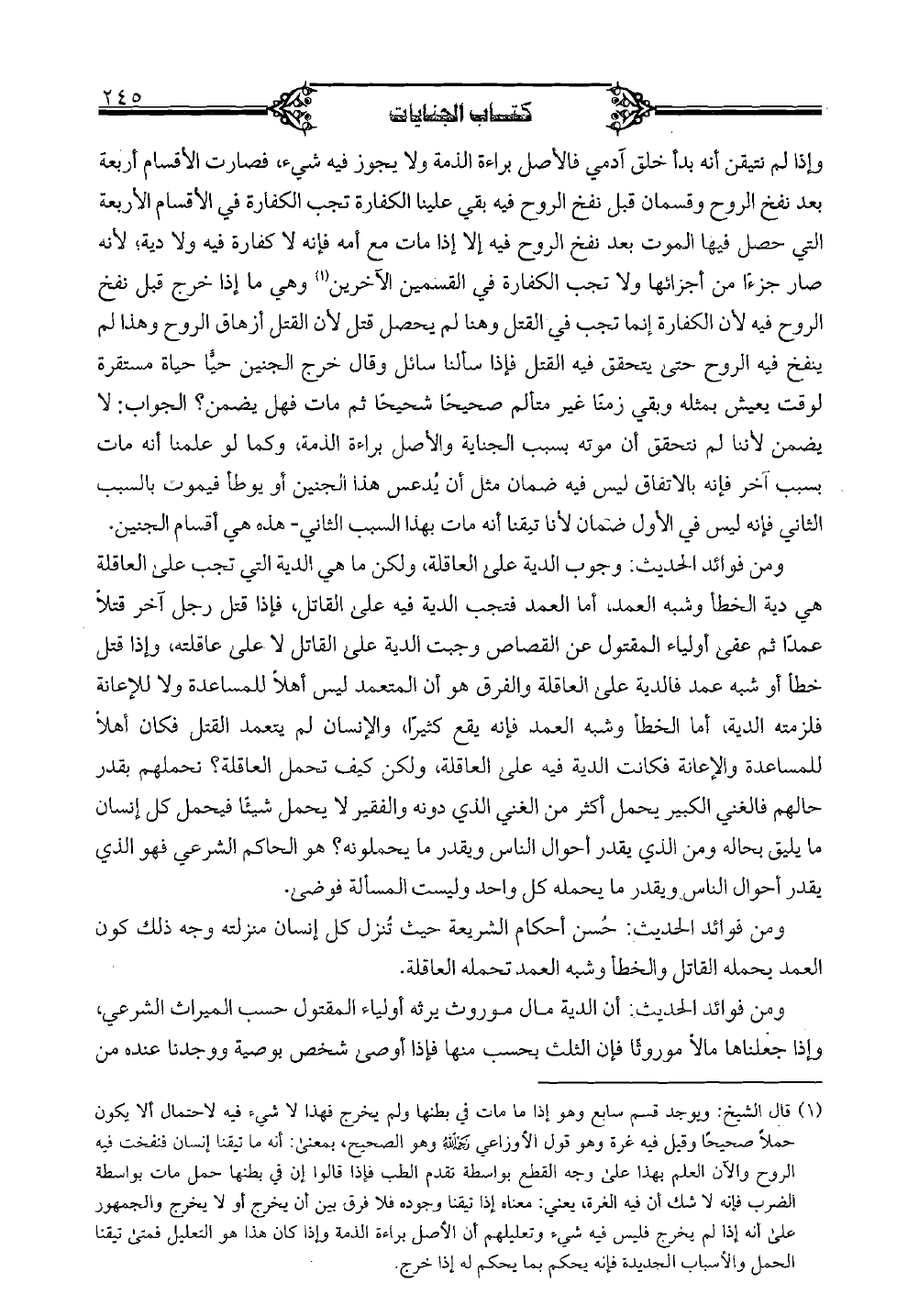 وإذا لم نتيقن أنه بدأ خلق آدمي فالأصل براءة الذمة ولا يجوز فيه شيء، فصارت الأقسام أربعة بعد نفخ الروح وقسمان قبل نفخ الروح فيه بقي علينا الكفارة في الأقسام الأربعة التي حصل فيها الموت بعد نفخ الروح فيه إلا إذا مات مع أمه فإنه لا كفارة فيه ولا دية؛ لأنه صار جزءًا من أجزائها ولا تجب الكفارة في القسمين الآخرين وهي ما إذا خرج قبل نفخ الروح فيه لأن الكفارة إنما تجب في القتل وهنا لم يحصل قتل لأن القتل أزهاق الروح وهذا لم ينفخ فيه الروح حتى يتحقق فيه القتل فإذا سألنا سائل وقال خرج الجنين حيًّا حياة مستقرة لوقت يعيش بمثله وبقي زمنًا غير متألم صحيحًا شحيحًا ثم مات فهل يضمن؟ الجواب: لا يضمن لأننا لم نتحقق أن موته بسبب الجناية والأصل براءة الذمة، وكما لو علمنا أنه مات بسبب آخر فإنه بالاتفاق ليس فيه ضمان مثل أن يدعس هذا الجنين أو يوطأ فيموت بالسبب الثاني فإنه ليس في الأول ضمان لأنا تيقنا أنه مات بهذا السبب الثاني- هذه هي أقسام الجنين.