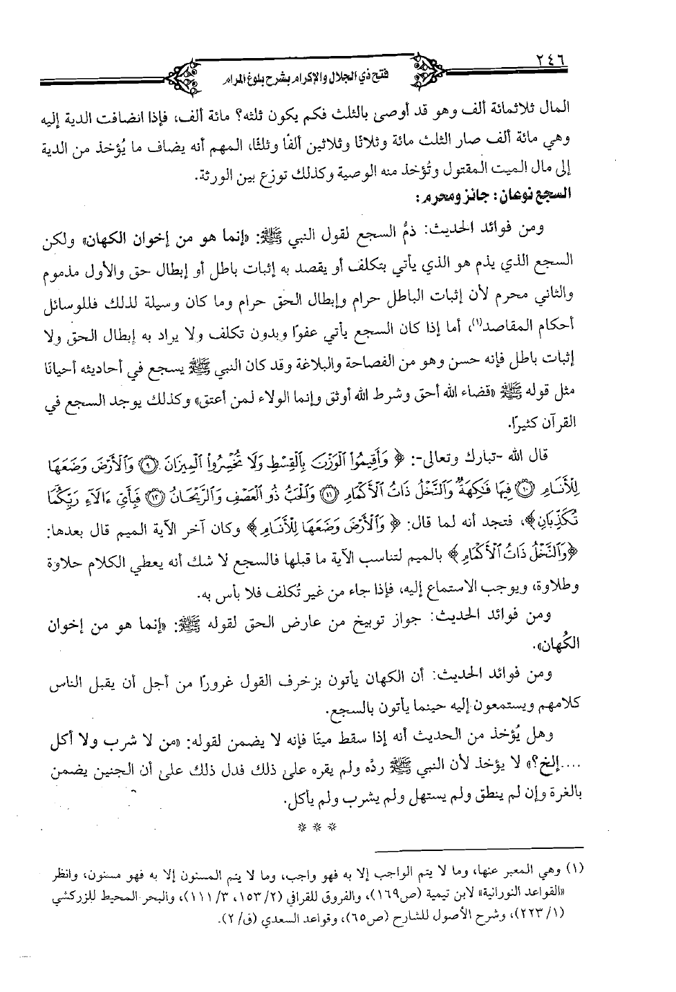 قال الله - تبارك وتعالى -: {وأقيموا الوزن بالقسط ولا تخسروا الميزان والأرض وضعها للأنام فيها فاكهة والنخل ذات الأكمام والحب ذو العصف والريحان فبأي آلاء ربكما تكذبان}، فتجد أنه لما قال: {والأرض وضعها للأنام} وكان آخر الآية الميم قال بعدها: {والنخل ذات الأكمام} بالميم لتناسب الآية ما قبلها فالسجع لا شك أنه يعطي الكلام حلاوة وطلاوة ويجب الاستمتاع إليه، فإذا جاء من غير تكلف فلا بأس به.