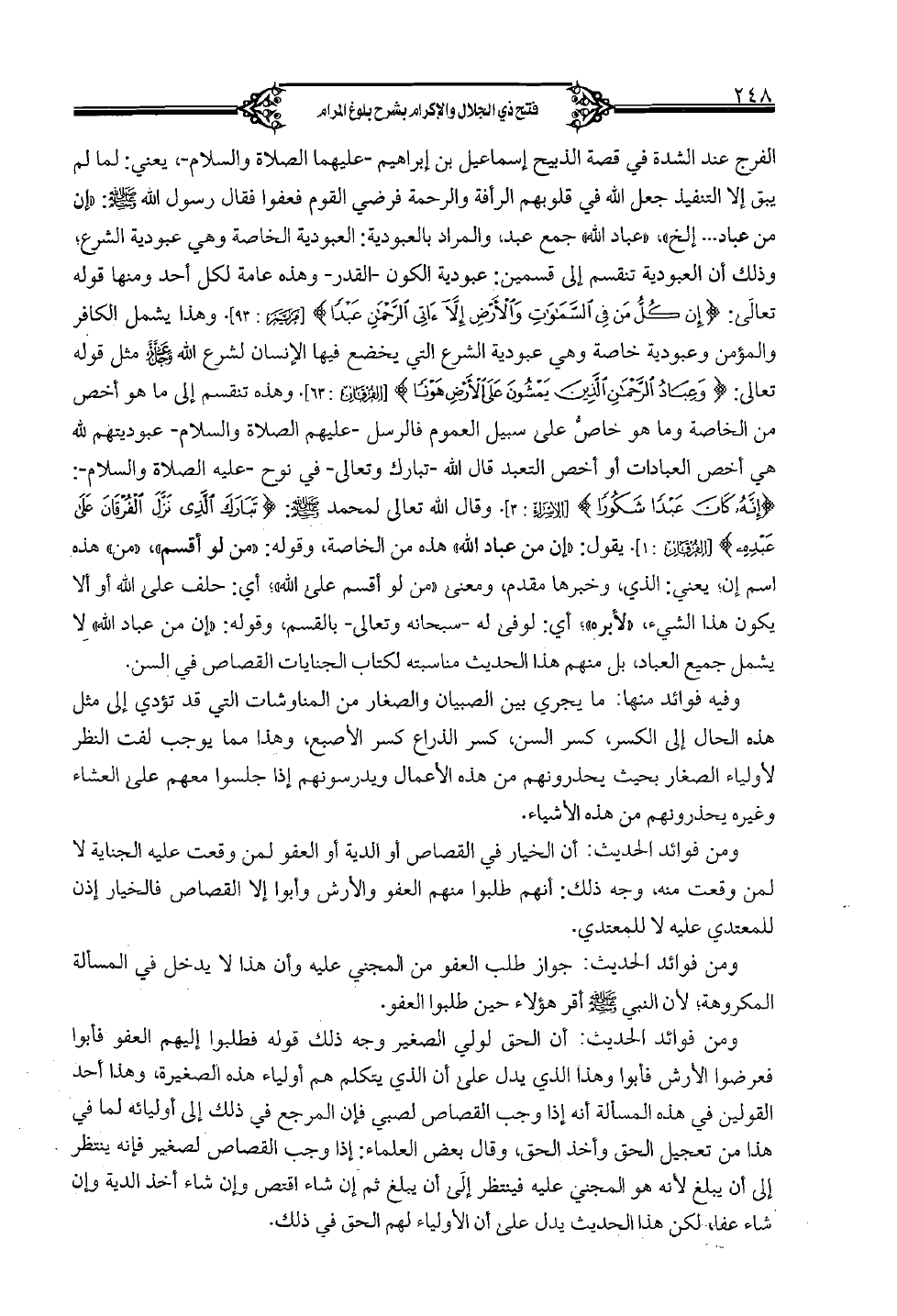 الفرج عند الشدة في قصة الذبيح إسماعيل بن إبراهيم - عليهما الصلاة والسلام -، يعني: لما لم يبق إلا التنفيذ جعل الله في قلوبهم الرأفة والرحمة فرضي القوم فعفوا فقال رسول الله صلى الله عليه وسلم: "إن من عباد .. الخ"، "عباد الله" جمع عبد، والمراد بالعبودية: العبودية الخاصة وهي عبودية الشرع؛ وذلك أن العبودية تنقسم إلى قسمين: عبودية الكون- القدر- وهذه عامة لكل أحد ومنها قوله تعالى: {إن كل من في السموات والأرض إلا أتي الرحمن عبدًا} [مريم 93]. وهذا يشمل الكافر والمؤمن وعبودية خاصة وهي عبودية الشرع التي يخضع فيها الإنسان لشرع الله عز وجل مثل قوله تعالى: {وعباد الرحمن الذين يمشون على الأرض هونًا} [الفرقان: 63] وهذه تنقسم إلى ما هو أخص من الخاصة وما هو خاص على سبيل العموم فالرسل - عليهم الصلاة والسلام- عبوديتهم لله هي أخص العبادات أو أخص التعبد قال الله- تبارك وتعالى- في نوح- عليه الصلاة والسلام-: