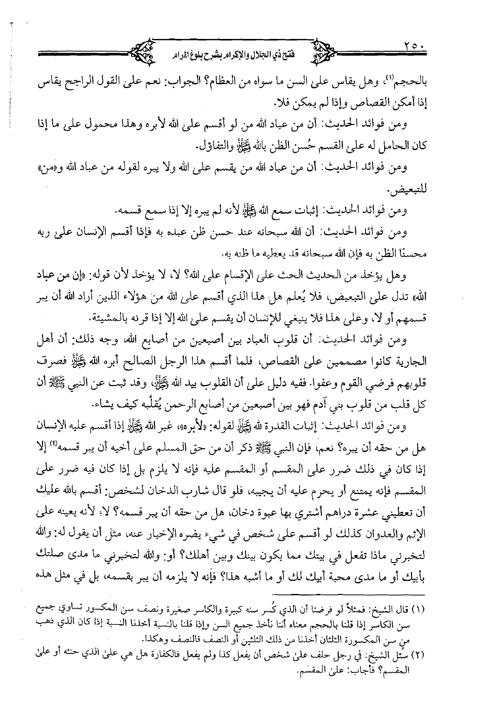 ومن فوائد الحديث: إثبات القدرة لله عز وجل لقوله: "لأبره"، غير الله عز وجل إذا اقسم عليه الإنسان هل من حقه أن يبره؟ نعم، فإن النبي صلى الله عليه وسلم ذكر أن من حق المسلم على أخيه أن يبر قسمه إلا كان في ذلك ضرر على المقسم أو المقسم عليه فإنه لا يلزم بل إذا كان فيه ضرر على المقسم فإنه يمتنع أو يحرم عليه أن يجيبه، فلو قال شارب الدخان لشخص: أقسم بالله عليك أن تعطيني عشرة دراهم أشتري بها عبوة دخان، هل من حقه أن يبر قسمه؟ لا؛ لأنه يعينه على الإثم والعدوان كذلك لو أقسم على شخص في شيء يضره الإخبار عنه، مثل أن يقول له: والله لتخبرني ماذا تفعل في بيتك مما يكون بينك وبين أهلك؟ أو: والله لتخبرني ما مدى صلتك بأبيك أو ما مدى محبة أبيك لك أو ما أشبه هذا؟ فإنه لا يلزمه أن يبر بقسمه، بل في مثل هذه