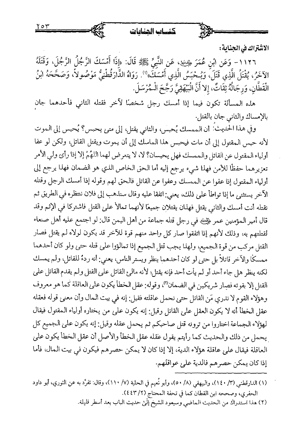 1126 - وعن ابن عمر رضي الله عنهما، عن النبي صلى الله عليه وسلم قال: "إذا أمسك الرجل الرجل، وقتله الآخر، يقتل الذي قتل، ويحبس الذي أمسك". رواه الدارقطني موصولًا، وصححه ابن القطان، ورجاله ثقات، إلا أن البيهقي رجح المرسل.