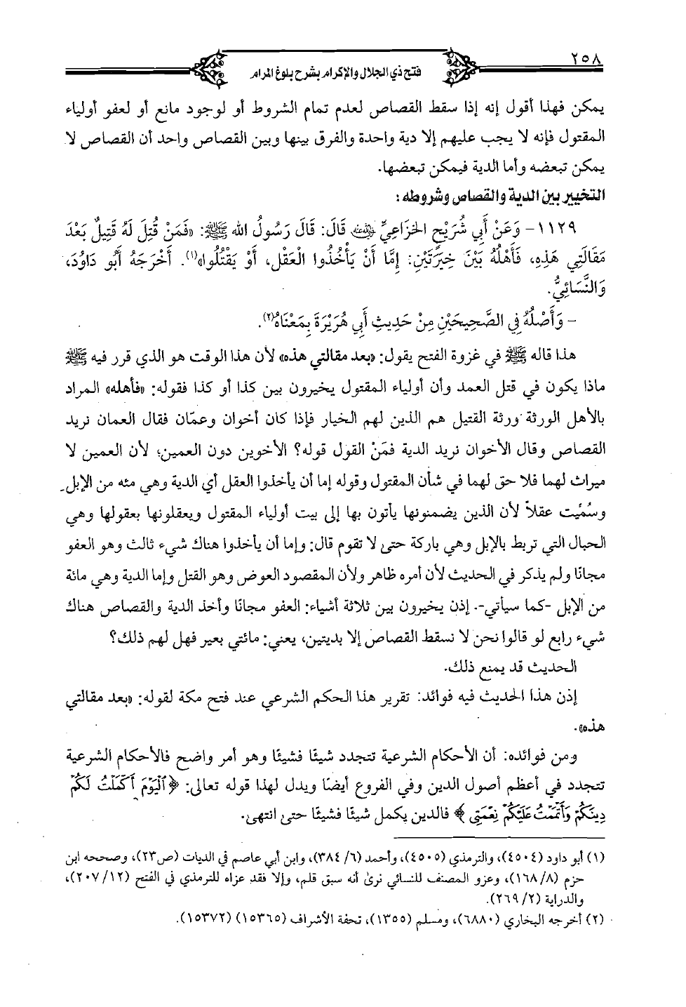 1129 - وعن ابن شريح الخزاعي رضي الله عنه قال: قال رسول الله صلى الله عليه وسلم: "فمن قتل له قتيل بعد مقالتي هذه، فأهله بين خيرتين: إما أن يأخذوا العقل، أو يقتلوا". أخرجه أبو داود، والنسائي.