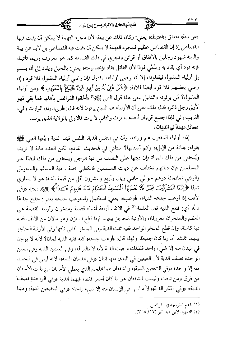 إذن أولياء المقتول هم ورثته وأن في النفس الدية، النفس فيها الدية وبينها النبي صلى الله عليه سلم بقوله: "مائة من الإبل"، وكم أسنانها؟ ستأتي في الحديث القادم، لكن العدد مائة لا تزيد، ويستثني من ذلك المرأة فإن ديتها على النصف من دية الرجل ويستثنى من ذلك أيضًا غير المسلمين فإن دياتهم تختلف عن ديات المسلمين فالكتابي نصف دية المسلم والمجوس والوثني ثمانمائة درهم حوالي مائتي ريال وأربع وعشرون أقل من قيمة الشاة هو لا يساوي شيئًا {إنما المشركون نجس فلا يقربوا المسجد الحرام بعد عامهم هذا} [التوبة: 28] "وفي الأنف إذا أوعب جدعه الدية"، "أوعب"؛ يعني: استكمل واستوعب جدعه يعني: جدع جدعًا تامًا؛ أي: قطع الدية قال العلماء في الأنف أربعة أشياء قصبة ومنخران وأرنبة القصبة هي العظم والمنخران معروفان والأرنبة الحاجز بينهما فإذا قطع المازن وهو ما لان من الأنف ففيه دية كاملة وإن قطع المنخر الواحد ففيه ثلث الدية وفي المنخر الثاني ثلثها وفي الأرنبة الحاجز بينهما ثلث، أما إذا كان جميعًا، ولهذا قال: "أوعب جدعه" كله ففيه الدية لماذا؟ لأنه لا يوجد في البدن منه إلا شيء واحد فلذلك وجبت الدية لأنه لا نظير له، وفي العينين الدية وفي العين الواحدة نصف الدية لأن العينين في البدن منها اثنان "وفي اللسان الدية"؛ لأنه ليس في الجسد منه إلا واحدة "وفي الشفتين الدية"، والشفتان هما اللحم الذي يغطي الأسنان من نابت الأسنان من فوق ومن تحت وليست الشفتان هو ما كان أحمر فقط، فيهما الدية "وفي الواحدة نصف الدية"، "وفي الذكر الدية"؛ لأنه ليس في الإنسان منه إلا شيء واحد، "وفي البيضتين الدية" وهما