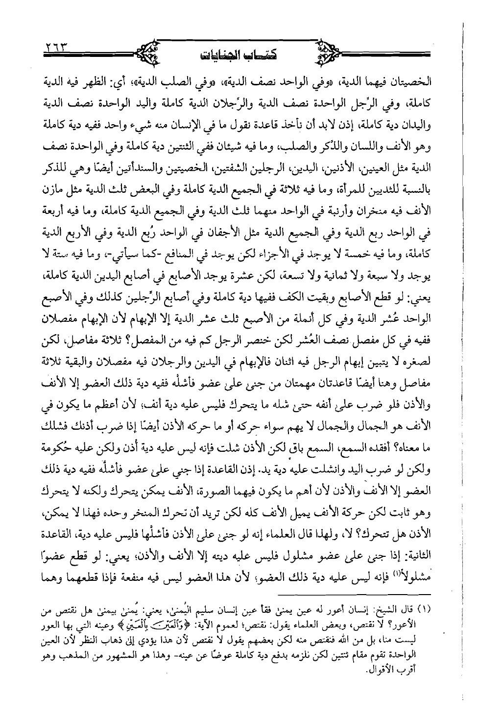 الخصيتان فيهما الدية، "وفي الواحد نصف الدية"، "وفي الصلب الدية"؛ أي: الظهر فيه الدية كاملة، وفي الرجل الواحدة نصف الدية والرجلان الدية كاملة واليد الواحدة نصف الدية واليدان دية كاملة، إذن لابد أن نأخذ قاعدة نقول ما في الإنسان منه شيء واحد ففيه دية كاملة وهو الأنف واللسان والذكر والصلب وما فيه شيئان ففي الثنتين دية كاملة وفي الواحدة نصف الدية مثل العينين، الأذنين، اليدين، الرجلين الشفتين، الخصيتين والسندأتين أيضًا وهي للذكر بالنسبة للثدييين للمرأة وما فيه ثلاثة في الجميع الدية كاملة وفي البعض ثلث الدية مثل مازن الأنف فيه منخران وأرنبة في الواحد منهما ثلث الدية وفي الجميع الدية كاملة وما فيه أربعة في الواحد ربع الدية وفي الجميع الدية مثل الأجفان في الواحد ربع الدية وفي الأربع الدية كاملة، وما فيه خمسة لا يوجد في الأجزاء لكن يوجد في المنافع- كما سيأتي-، وما فيه ستة لا يوجد ولا سبعة ولا ثمانية ولا تسعة لكن عشرة يوجد الأصابع في أصابع اليدين الدية كاملة يعني: لو قطع الأصابع وبقيت الكف ففيها دية كاملة وفي أصابع الرجلين كذلك وفي الأصبع الواحد عشر الدية وفي كل أنملة من الأصبع ثلث عشر الدية إلا الإبهام لأن الإبهام مفصلان ففيه في كل مفصل نصف العشر لكن خنصر الرجل كم فيه من المفصل؟ ثلاثة مفاصل، لكن لصغره لا يتبين إبهام الرجل فيه اثنان فالإبهام في اليدين والرجلان فيه مفصلان والبقية ثلاثة مفاصل وهنا أيضًا قاعدتان مهمتان من جنى على عضو فأشله ففيه دية ذلك العضو إلا الأنف والأذن فلو ضرب على أنفه حتى شله ما يتحرك فليس عليه دية أنف، لأن أعظم ما يكون في الأنف هو الجمال والجمال لا يهم سواء حركه أو ما حركه الأذن أيضًا إذا ضرب أذنك فشلك ما معناه؟ أفقده السمع، السمع باق لكن الأذن شلت فإنه ليس عليه دية أذن ولكن عليه حكومة ولكن لو ضرب اليد وانشلت عليه دية يد. إذن القاعدة إذا جني على عضو فأشله ففيه دية ذلك العضو إلا الأنف والأذن لأن أهم ما يكون فيهما الصورة الأنف يمكن يتحرك ولكنه لا يتحرك وهو ثابت لكن حركة الأنف يميل الأنف كله لكن تريد أن تحرك المنخر وحده فهذا لا يمكن الأذن هل تتحرك؟ لا، ولهذا قال العلماء إنه لو جنى على الأذن فأشلها فليس عليه دية، القاعدة الثانية: إذا جنى على عضو مشلول فليس عليه ديته إلا الأنف والأذن يعني: لو قطع عضوًا مشلولًا فإنه ليس عليه دية ذلك العضو لأن هذا العضو ليسس فيه منفعة فإذا قطعهما وهما