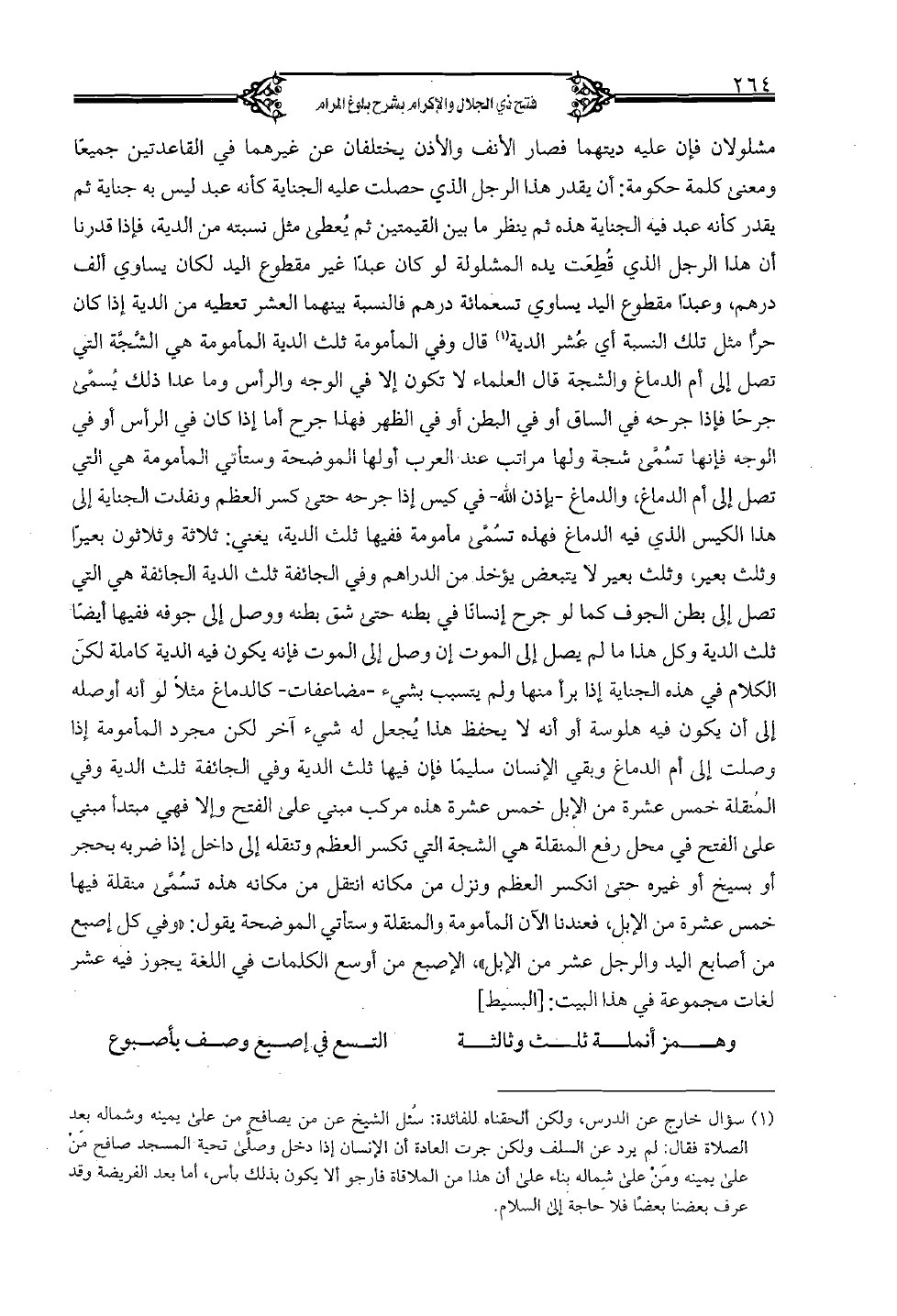 مشلولان فإن عليه ديتهما فصار الأنف والأذن يختلفان عن غيرهما في القاعدتين جميعًا ومعنى كلمة حكومة: أن يقدر هذا الرجل الذي حصلت عليه الجناية كأنه عبد ليس به جناية ثم يقدر كأنه عبد فيه الجناية هذه ثم ينظر ما بين القيمتين ثم يعطى مثل نسبته من الدية فإذا قدرنا أن هذا الرجل الذي قطعت يده المشولة لو كان عبدًا غير مقطوع اليد لكان يساوي ألف درهم، وعبدًا مقطوع اليد يساوي تسعمائة درهم فالنسبة بينهما العشر تعطيه من الدية إذا كان حرًا مثل تلك النسبة أي عشر الدية قال وفي المأمومة ثلث الدية المأمومة هي الشجة التي تصل إلى أم الدماغ والشجة قال العلماء لا تكون إلا في الوجه والرأس وما عدا ذلك يسمى جرحًا فإذا جرحه في الساق أو في البطن أو في الظهر فهذا جرح أما إذا كان في الرأس أو في الوجه فإنها تسمى شجة ولها مراتب عند العرب أولها الموضحة وستأتي المأمومة هي التي تصل إلى أم الدماغ والدماغ - بإذن الله- في كيس إذا جرحه حتى كسر العظم ونفذت الجناية إلى هذا الكيس الذي فيه الدماغ فهذه تسمى مأمومة ففيها ثلث الدية يعني: ثلاثة وثلاثون بعيرًا وثلث بعير، وثلث بعير لا يتبعض يؤخذ من الدراهم وفي الجائفة ثلث الدية الجائفة هي التي تصل إلى بطن الجوف كما لو جرح إنسانًا في بطنه حتى شق بطنه ووصل إلى جوفه ففيها أيضًا ثلث الدية وكل هذا ما لم يصل إلى الموت إن وصل إلى الموت فإنه يكون فيه الدية كاملة لكن الكلام في هذه الجناية إذا برأ منها ولم يتسبب بشيء - مضاعفات- كالدماغ مثلًا لو أنه أوصله إلى أن يكون فيه هلوسة أو أنه لا يحفظ هذا يجعل له شيء آخر لكن مجرد المأمومة إذا وصلت إلى أم الدماغ وبقي الإنسان سليمًا فإن فيها ثلث الدية وفي الجائفة ثلث الدية وفي المنقلة خمس عشرة من الإبل خمس عشرة هذه مركب مبني على الفتح وإلا فهي مبتدأ مبني على الفتح في محل رفع المنقلة هي الشجة التي تكسر العظم وتنقله إلى داخل إذا ضربه بحجر أو بسيخ أو غيره حتى انكسر العظم ونزل من مكانه انتقل من مكانه هذه تسمى منقلة فيها خمس عشرة من الإبل فعندنا الآن المأمومة والمنقلة وستأتي الموضحة يقول: "وفي كل إصبع من أصابع اليد والرجل عشر من الإبل"، الإصبع من أوسع الكلمات في اللغة يجوز فيه عشر لغات مجموعة في هذا البيت: [البسيط]