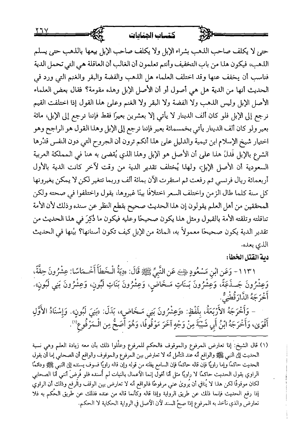 1131 - وعن ابن مسعود (رضي الله عنه) عن النبي (صلى الله عليه وسلم) قال: "دية الخطأ أخماسًا: عشرون حقَّةً، وعشرون جذعةً، وعشرون بنات مخاضٍ، وعشرون بنات لبونٍ، وعشرون بني لبونٍ". أخرجه الدارقطني.