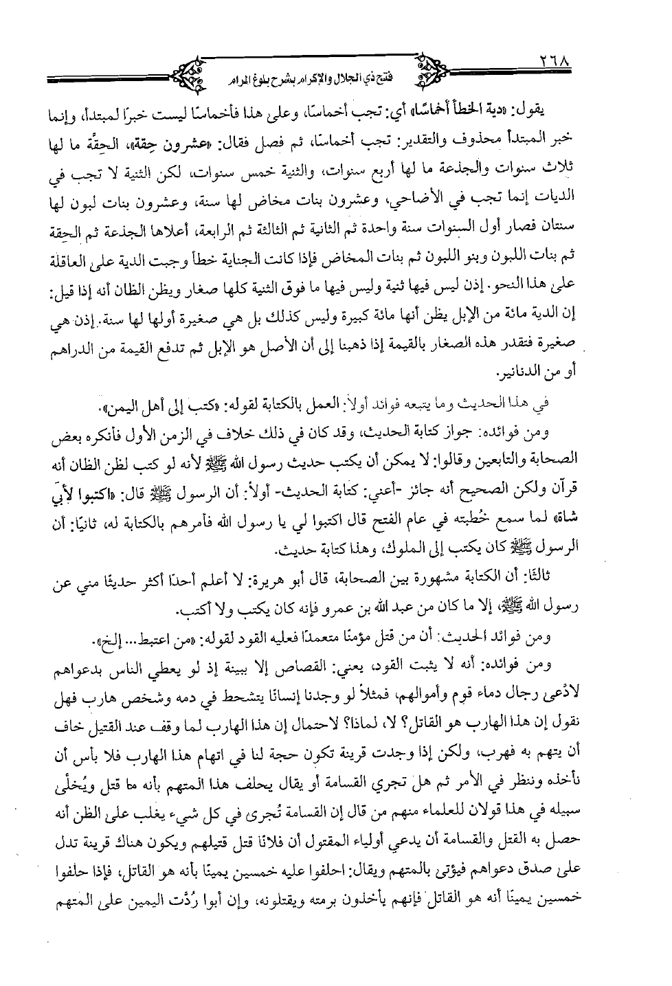 يقول: "دية الخطأ أخماسًا" أي: تجب أخماسًا، وعلى هذا فأخماسًا ليست خبرًا لمبتدأ، وإنما خبر المبتدأ محذوف والتقدير: تجب أخماسًا، ثم فصل فقال: "عشرون حقة"، الحقة ما لها ثلاث سنوات والجذعة ما لها أربع سنوات، والثنية خمس سنوات، لكن الثنية لا تجب في الديات إنما تجب في الأضاحي، وعشرون بنات مخاض لها سنة، وعشرون بنات لبون لها سنتان فصار أول السنوات سنة واحدة ثم الثانية ثم الثالثة ثم الرابعة، أعلاها الجذعة ثم الحقة ثم بنات اللبون وبنو اللبون ثم بنات المخاض فإذا كانت الجناية خطأ وجبت الدية على العاقلة على هذا النحو. إذن ليس فيها ثنية وليس فيها ما فوق الثنية كلها صغار ويظن الظان أنه إذا قيل: إن الدية مائة من الإبل يظن أنها مائة كبيرة وليس كذلك بل هي صغيرة أولها لها سنة. إذن هي صغيرة فتقدر هذه الصغار بالقيمة إذا ذهبنا إلى أن الأصل هو الإبل ثم تدفع القيمة من الدراهم أو من الدنانير.