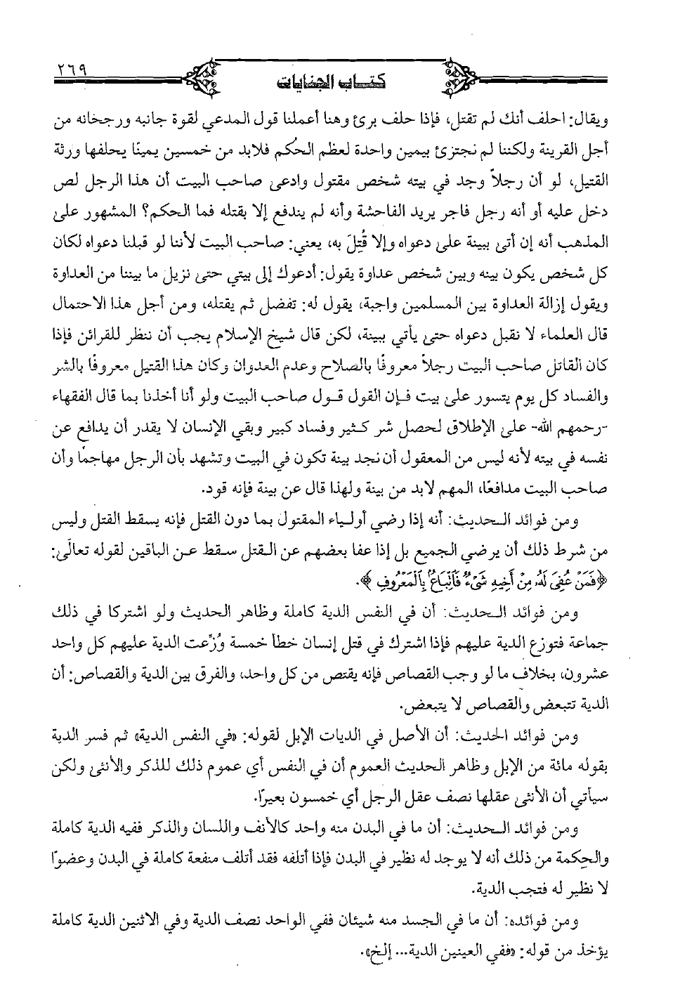 ويقال: احلف أنك لم تقتل، فإذا حلف برئ وهنا أعملنا قول المدعي لقوة جانبه ورجحانه من أجل القرينة ولكننا لم نجتزئ بيمين واحدة لعظم الحكم فلابد من خمسين يمينًا يحلفها ورثة القتيل، لو أن رجلًا وجد في بيته شخص مقتول وادعى صاحب البيت أن هذا الرجل لص دخل عليه أو أنه رجل فاجر يريد الفاحشة وأنه لم يندفع إلا بقتله فما الحكم؟ المشهور على المذهب أنه إن أتى ببينة على دعواه وإلا قتل به، يعني: صاحب البيت لأننا لو قبلنا دعواه لكان كل شخص يكون بينه وبين شخص عداوة يقول: أدعوك إلى بيتي حتى نزيل ما بيننا من العداوة ويقول إزالة العداوة بين المسلمين واجبة، يقول له: تفضل ثم يقتله، ومن أجل هذا الاحتمال قال العلماء لا نقبل دعواه حتى يأتي ببينة، لكن قال شيخ الإسلام يجب أن ننظر للقرائن فإذا كان القاتل صاحب البيت رجلًا معروفًا بالصلاح وعدم العدوان وكان هذا القتيل معروفًا بالشر والفساد كل يوم يتسور على بيت فإن القول قول صاحب البيت ولو أن أخذنا بما قاله الفقهاء- رحمهم الله- على الإطلاق لحصل شر كثير وفساد كبير وبقي الإنسان لا يقدر أن يدافع عن نفسه في بيته لأنه ليس من المعقول أن نجد بينة تكون في البيت وتشهد بأن الرجل مهاجمًا وأن صاحب البيت مدافعًا، المهم لابد من بينة ولهذا قال عن بينة فإنه قود.