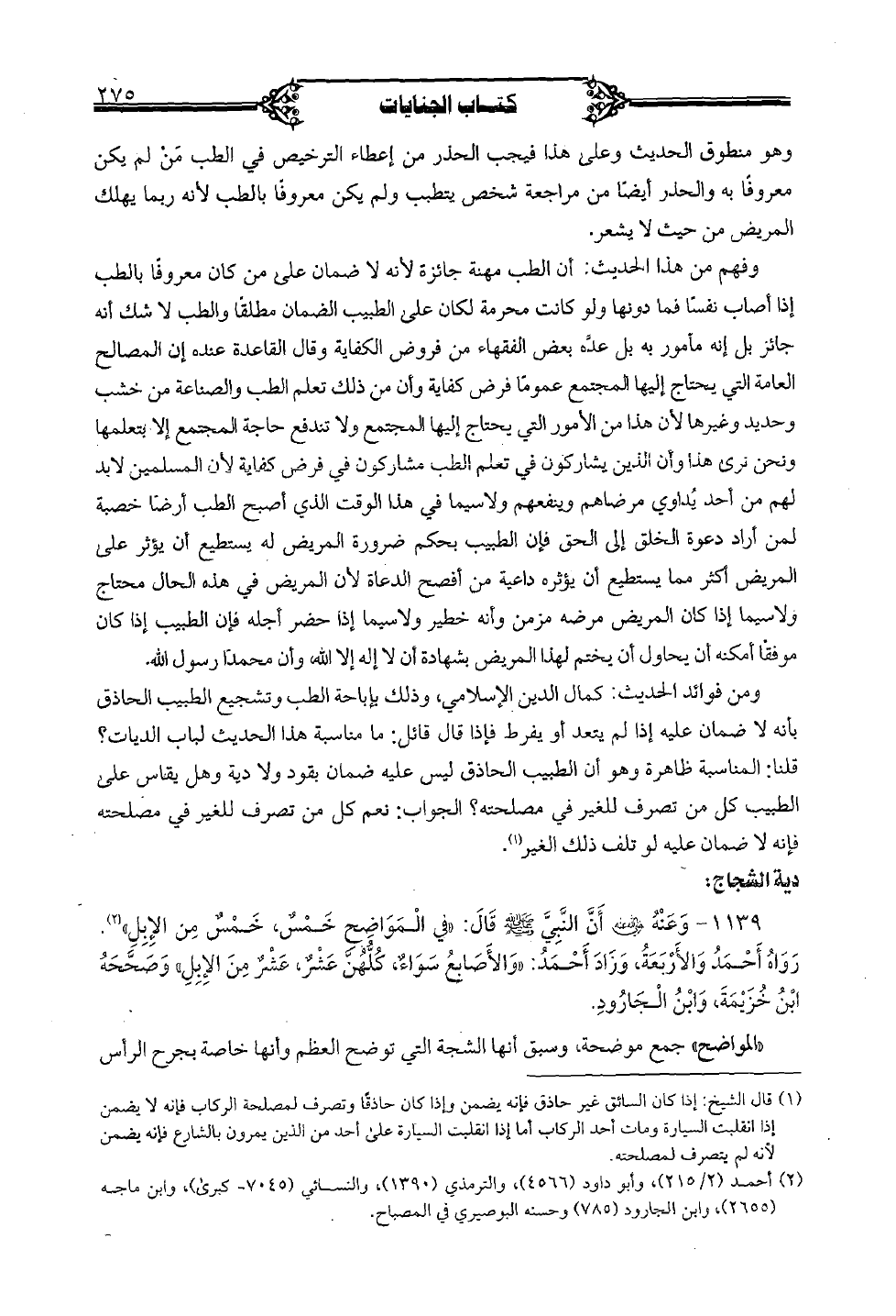 1139 - وعنه (رضي الله عنه) أن النبي (صلى الله عليه وسلم) قال: "في المواضح خمسٌ، خمسٌ من الإبل". رواه أحمد والأربعة، وزاد أحمد: "والأصابع سواءٌ، كلُّهن عشرٌ، عشرٌ من الإبل" وصحَّحه ابن خزيمة، وابن الجارود.