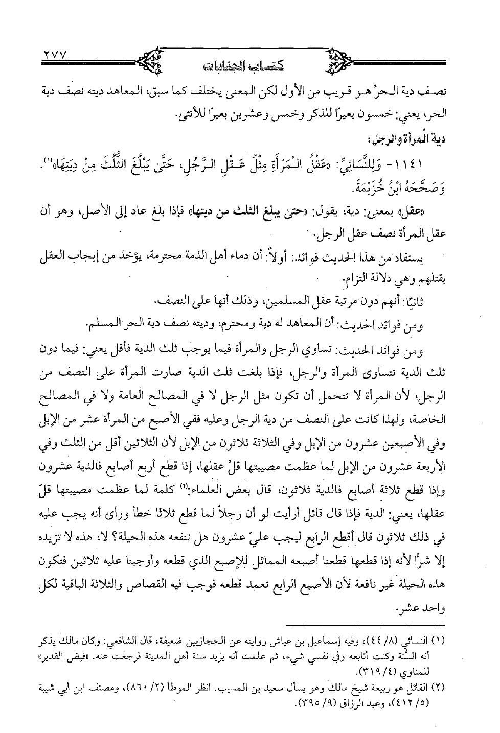 1141 - وللنسائي: "عقل المرأة مثل عقل الرجل، حتى يبلغ الثلث من ديتها".