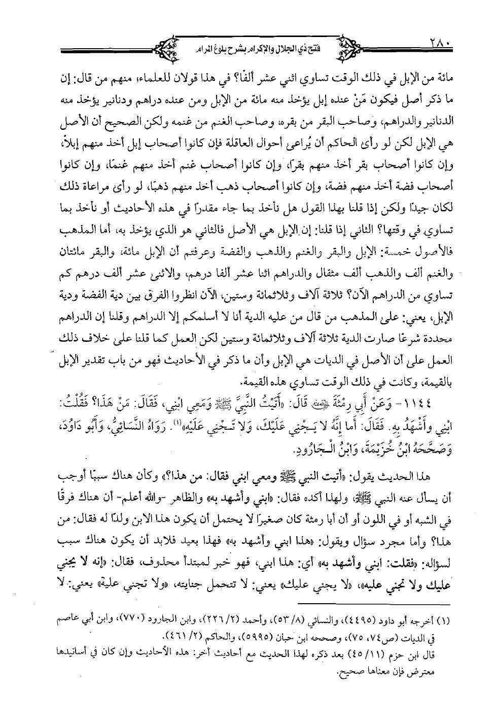 1144 - وعن أبي رمثة رضي الله عنه قال: "أتيت النَّبيَّ صلى الله عليه وسلم ومعي ابني، فقال: من هذا؟ فقلت: ابني وأشهد به. فقال: أما إنَّه لا يجني عليك، ولا تجني عليه". روان النَّسائيُّ، وأبو داود، وصحَّحه ابن خزيمة، وابن الجارود.