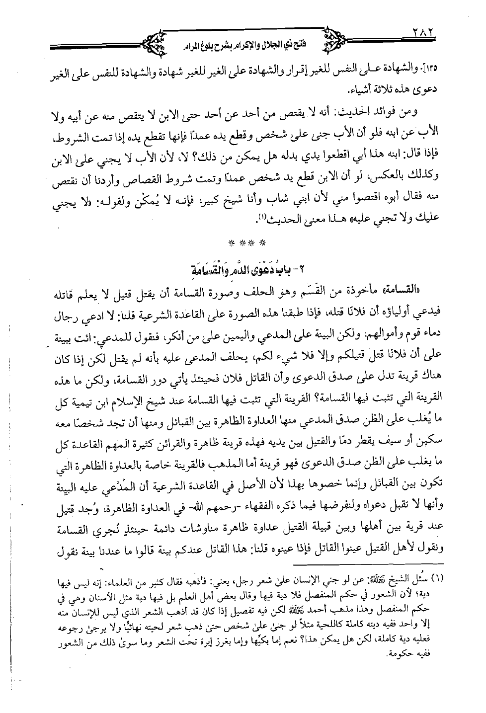 "القسامة" مأخوذة من القسم وهو الحلف وصورة القسامة أن يقتل قتيل لا يعلم قاتله فيدعي أولياؤه أن فلانًا قتله، فإذا طبقنا هذه الصورة على القاعدة الشرعية قلنا: لا ادعي رجال دماء قوم وأموالهم، ولكن البينة على المدعي واليمين على من أنكر، فنقول للمدعي: ائت ببينة على أن فلانًا قتل قتيلكم وإلا فلا شيء لكم، يحلف المدعى عليه بأنه لم يقتل لكن إذا كان هناك قرينة تدل على صدق الدعوى وأن القاتل فلان فحينئذ يأتي دور القسامة، ولكن ما هذه القرينة التي تثبت فيها القسامة؟ القرينة التي تثبت فيها القسامة عند شيخ الإسلام ابن تيمية كل ما يُغلب على الظن صدق المدعي منها العداوة الظاهرة بين القبائل ومنها أن تجد شخصًا معه سكين أو سيف يقطر دمًا والقتيل بين يديه فهذه قرينة ظاهرة والقرائن كثيرة المهم القاعدة كل ما يغلب على الظن صدق الدعوى فهو قرينة أما المذهب فالقرينة خاصة بالعداوة الظاهرة التي تكون بين القبائل وإنما خصوها بهذا لأن الأصل في القاعدة الشرعية أن المدَّعي عليه البينة وأنها لا تقبل دعواه ولنفرضها فيما ذكره الفقهاء -رحمهم الله- في العداوة الظاهرة، وُجد قتيل عند قرية بين أهلها وبين قبيلة القتيل عداوة ظاهرة مناوشات دائمة حينئذٍ تُجري القسامة ونقول لأهل القتيل عينوا القاتل فإذا عينوه قلنا: هذا القاتل عندكم بينة قالوا ما عندنا بينة نقول