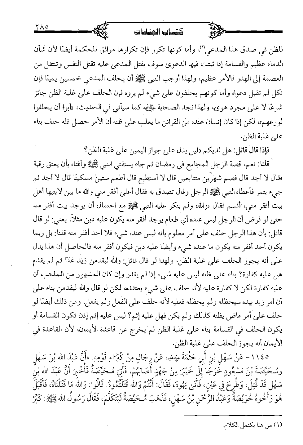 1145 - عن سهل بن أبي حثمة رضي الله عنه، لكن رجالٍ من كبراء قومه: "أن عبد الله بن سهلٍ ومحيِّضة بن مسعودٍ خرجا إلى خيبر من جهدٍ أصابهم، فأتي محيِّصة فأخبر أن عبد الله بن سهل قد قُتل، وطرح في عينٍ، فأتى يهود، فقال: أنتم والله قتلتموه. قالوا: والله ما قتلناه، فأقبل هو وأخوة حويصة وعبد الرحمن بن سهلٍ، فذهب محيصة ليتكلَّم، فقال رسول الله صلى الله عليه وسلم: كبِّر