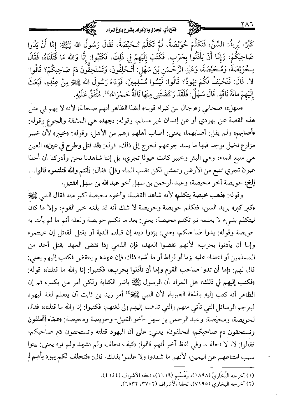 وقوله: "ذهب محيصة يتكلم" لأنه شاهد القضية، وأخوه محيصة أكبر منه فقال النبي صلى الله عليه وسلم "كبر كبر" يريد السن، فتكلم حويصة وحويصة لا شك أنه قد بلغه خبر القوم، وإلا ما كان ليتكلم بشيء لا يعلمه ثم تكلم محيصة، يعني: بعد ما تكلم حويصة ولعلة أتم ما لم يأت به حويصة وقوله: يدوا صاحبكم، يعمي: يؤدوا ديته إن قبلتم الدية أو يقتل القاتل إن عينتموه وإما أن يأذنوا بحرب؛ لأنهم نقضوا العهد، فإن الذمي إذا نقض العهد بقتل أحد من المسلمين أو اعتداء عليه بزنا او لواط أو ما أشبه ذلك فإن عهدهم ينتقض فكتب إليهم يعني: قال لهم: "إما أن تدوا صاحب القوم وإما أن تأذنوا بحرب"، فكتبوا: إنا والله ما قتلناه، قوله: "فكتب إليهم في ذلك" هل المراد أن الرسول صلى الله عليه وسلم باشر الكتابة ولكن أمر من يكتب ثم إن الظاهر أنه كتب إليه باللغة العبرية؛ لأن النبي صلى الله عليه وسلم أمر زيد بن ثابت أن يتعلم لغة اليهود ليترجم الرسائل التي تأتي منهم والتي تذهب إليهم إلى لغتهم، فكتبوا: إنا والله ما قتلناه، فقال لحويصة، ومحيصة، وعبد الرحمن بن سهل -أخو القتيل- وحويصة ومحيصة: "عمّاه أتحلفون وتستحقون دم صاحبكم" أتحلفون؛ يعني: على أن اليهود قتلته وتستحقون دم صاحبكم، فقالوا: لا، لا نحلف. وفي لفظ آخر أنهم قالوا: "كيف نحلف ولم نشهد ولم نر" يعني: بينوا سبب امتناعهم عن اليمين؛ لأنهم ما شهدوا ولا علموا بذلك. قال: "فتحلف لكم يهود بأنهم لم