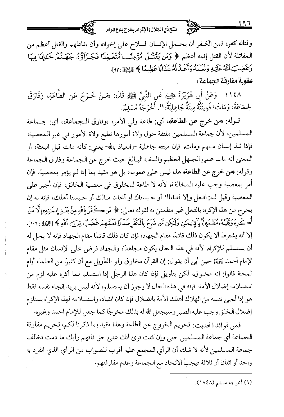 1148 - وعن أبي هريرة رضى الله عنه عن النبيِّ صلى الله عليه وسلم قال: "من خرج عن الطَّاعة، وفارق الجماعة، ومات؛ فميتته ميتةٌ جاهليَّةٌ"، أخرجه مسلمٌ.