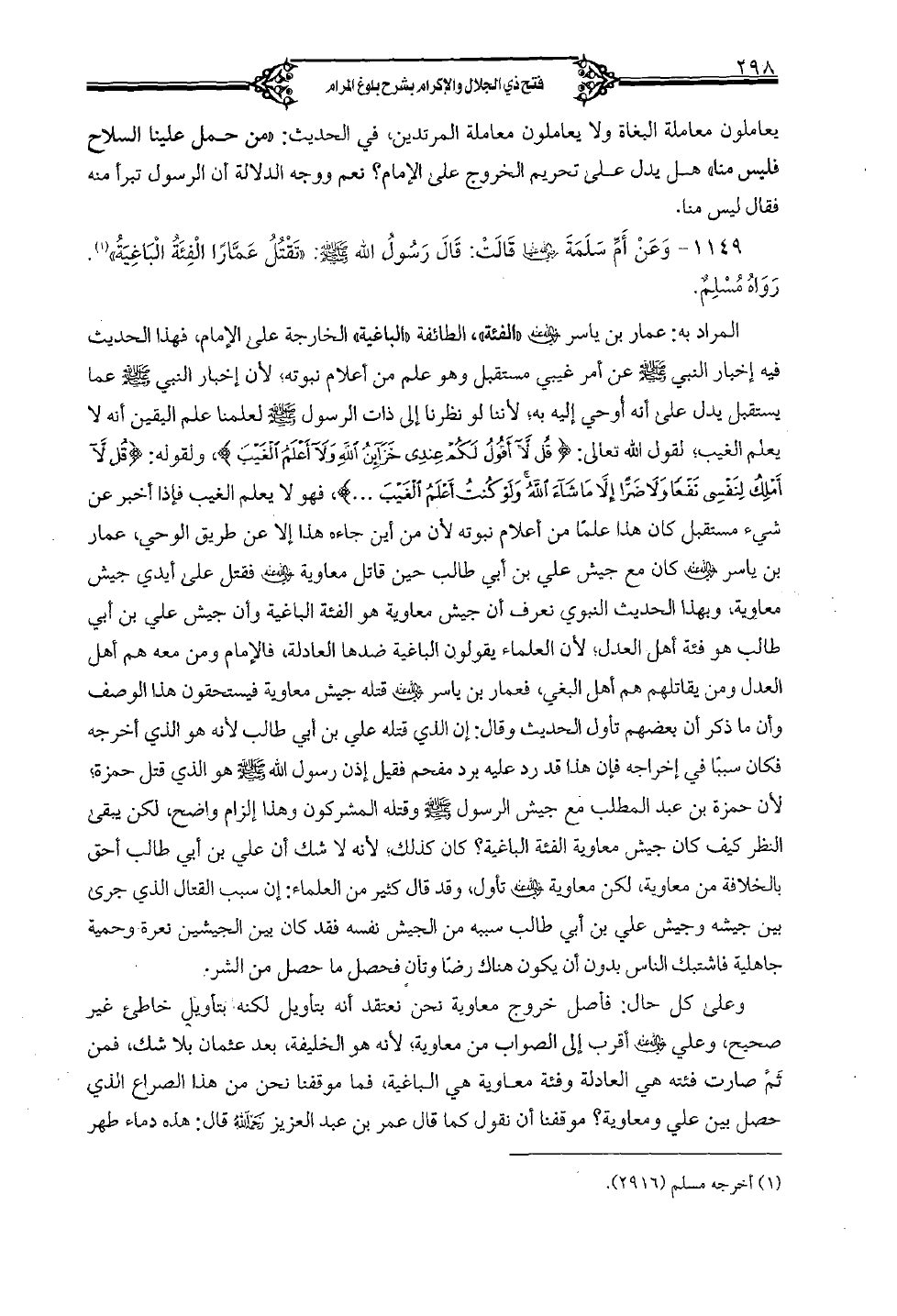 1149 - وعن أمِّ سلمة رضى الله عنها قالت: قال رسول الله صلى الله عليه وسلم: "تقتل عمارًا الفئة الباغية" رواه مسلمٌ.
