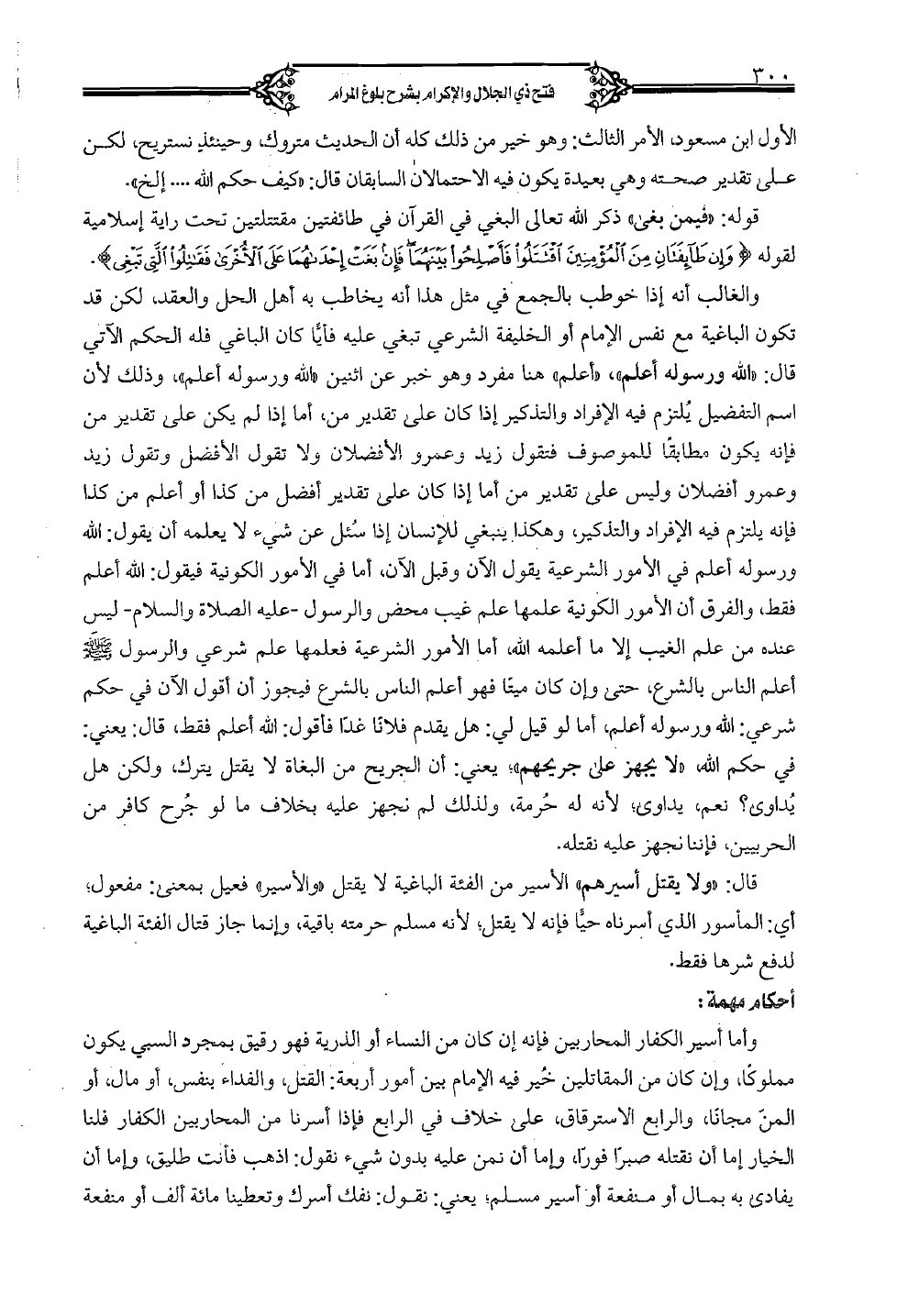 والغالب أنه إذا خوطب بالجمع في مثل هذا أنه يخاطب به أهل الحل والعقد، لكن قد تكون الباغية مع نفس الإمام أو الخليفة الشرعي تبغي عليه فأيَّا كان الباغي فله الحكم الآتي قال: "الله ورسوله أعلم"، "أعلم" هنا مفرد وهو خبر عن اثنين "الله ورسوله أعلم"، وذلك لأن اسم التفضيل يُلتزم فيه الإفراد والتذكير إذا كان على تقدير من، أما إذا لم يكن على تقدير من فإنه يكون مطابقًا للموصوف فيقول زيد وعمرو الأفضلان ولا تقول زيد وعمرو أفضلان وليس على تقدير من أما إذا كان على تقدير أفضل من كذا أو أعلم من كذا فإنه يلتزم فيه الإفراد والتذكير، وهكذا ينبغي للإنسان إذا سُئل عن شيء لا يعلمه أن يقول: الله ورسوله أعلم في الأمور الشرعية يقول الآن وقبل الآن، أما في الأمور الكنية فيقول: الله أعلم فقط، والفرق أن الأمور الكونية علمها علم غيب محض والرسول -صلى الله عليه وسلم- ليس عنده من علم الغيب إلا ما أعلمه الله، أما الأمور الشرعية فعلمها علم شرعي والرسول صلى الله عليه وسلم اعلم الناس بالشرع، حتى وإن كان ميتًا فهو أعلم الناس فيجوز أن أقول الآن في حكم شرعي: الله ورسوله أعلم، أما لو قيل لي: هل يقدم فلانًا غدًا فأقول: الله أعلم فقط، قال: يعني: في حكم الله، "لا يجهز على جريحهم"؛ يعني: ان الجريح من البغاة لا يقتل يترك، ولكن هل يُداوى؟ نعم؛ يداوى؛ لأنه له حُرمة، ولذلك لم نجهز عليه بخلاف ما لو جُرح كافر من الحربيين، فإننا نجهز عليه نقتله.