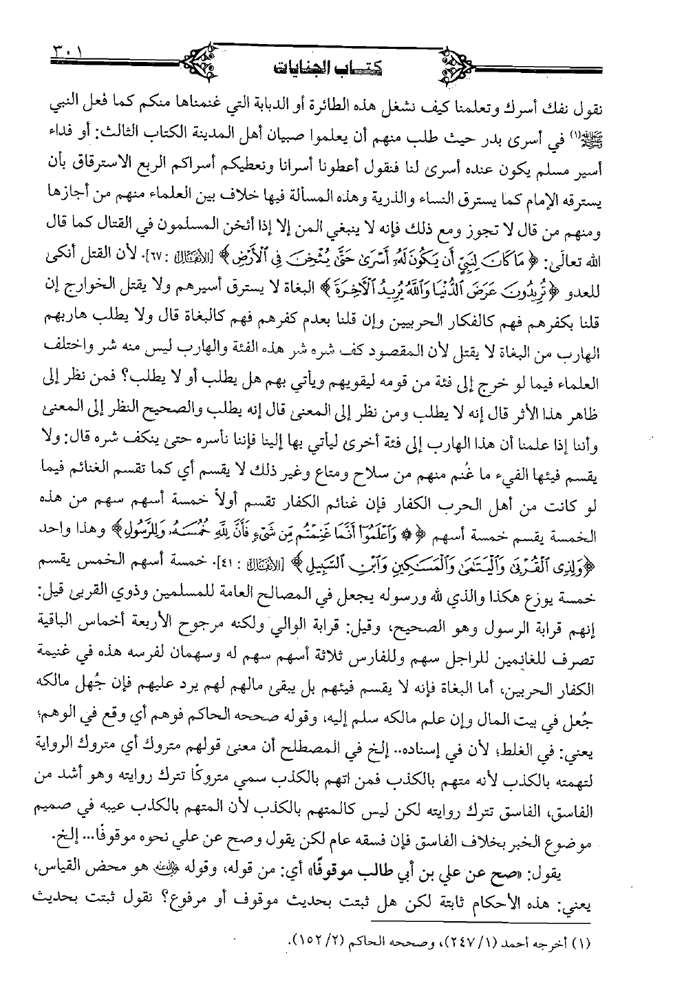 نقول نفك أسرك وتعلمنا كيف نشغل هذه الطائرة أو الدبابة التي غنمناها منكم كما فعل النبي صلى الله عليه وسلم في أسرى بدر حيث طلب منهم أن يعلموا صبيان أهل المدينة الكتاب الثالث: أو فداء أسير مسلم يكون عنده أسرى لنا فنقول أعطونا أسرانا ونعطيكم أسراكم الربع الاسترقاق بأن يسترقه الإمام كما يسترق النساء والذرية وهذه المسألة فيها خلاف بين العلماء منهم من أجازها ومنهم من قال لا تجوز ومع ذلك فإنه لا ينبغي المن إلا إذا أثخن المسلمون في القتال كما قال الله تعالى: (ما كان لنبيٍ أن يكون له أسرى حتى يُثخن فى الأرض) [الأنفال: 67]. لأن القتل أنكى للعدو (تريدون عرض الدنيا والله يريد الأخرة) البغاة لا يسترق أسيرهم ولا يقتل الخوارج إن قلنا بكفرهم فهم كالكفار الحربيين وإن قلنا بعدم كفرهم فهم كالبغاة قال ولا يطلب هاربهم الهارب من البغاة لا يقتل لأن المقصود كف شره هذه الفئة والهارب ليس منه شر واختلف العلماء فيما لو خرج إلى فئة من قومه ليقويهم ويأتي بهم هل يطلب أو لا يطلب؟ فمن نظر إلى ظاهر هذا الأثر قال إنه لا يطلب ومن نظر إلى ظاهر هذا الأثر قال إنه لا يطلب ومن نظر إلى المعنى قال إنه يطلب والصحيح النظر إلى المعنى وأننا إذا لعمنا أن هذا الهارب إلى فئة أخرى ليأتي بها إلنا فإننا نأسره حتى ينكف شره قال: ولا يقسم فيئها الفيء ما غُنم منهم من سلاح ومتاع وغير ذلك لا يقسم أي كما تقسم الغنائم فيما لو كانت من أهل الحرب الكفار فإن غنائم الكفار تقسم أولاً خمسة أسهم سهم من هذه الخمسة يقسم خمسة أسهم (واعلموا أنَّما غنمتم من شيءٍ فإنَّ لله خمسه وللرَّسول) وهذا واحد (ولذى القربي واليتامى والمساكين وابن السبيل) [الأنفال: 41]، خمسة أسهم الخمس يقسم خمسة يوزع هكذا والذي لله ورسوله يجعل في المصالح العامة للمسلمين وذوي القربي قيل: إنهم قرابة الرسول وهو الصحيح، وقيل: قرابة الوالي ولكنه مرجوح الأربعة أخماس الباقية تصرف للغانمين للراجل سهم وللفارس ثلاثة أسهم سهم له وسهمان لفرسه هذه في غنيمة الكفار الحربين، أما البغاة فإنه لا يقسم فيئهم بل يبقى مالهم لهم يرد عليهم فإن جُهل مالكه جُعل في بيت المال وإن علم مالكه سلم إليه، وقوله صححه الحاكم فوهم أي وقع في الوهم؛ يعني: في الغلط؛ لأن في إسناده .. إلخ في المصطلح أن معنى قولهم متروك أي متروك الرواية لتهمته بالكذب لأنه متهم بالكذب فمن اتهم بالكذب سمي متروكًا تترك روايته وهو أشد من الفاسق، الفاسق تترك روايته لكن ليس كالمتهم بالكذب لأن المتهم بالكذب عيبه في صميم موضوع الخبر بخلاف الفاسق فإن فسقه عام لكن يقول وصح عن علي نحوه موقوفًا ... إلخ.