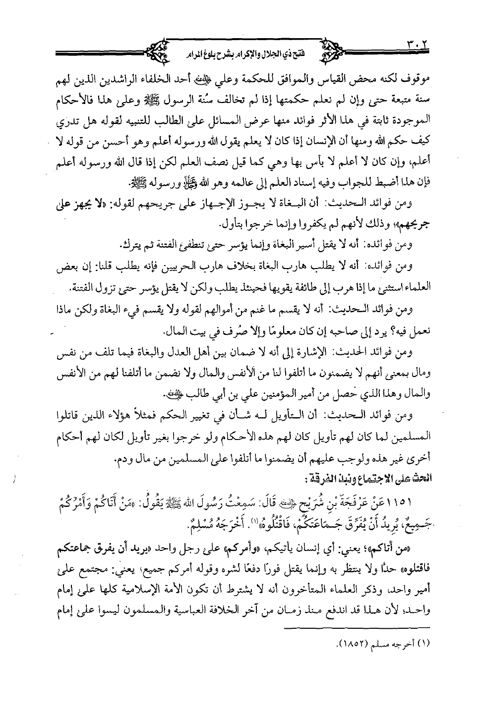 1151 - عن عرفجة بن شريحٍ رضى الله عنه قال: سمعت رسول الله صلى الله عليه وسلم يقول: "من أتاكم وأمرككم جميعٌ، يريد أن يفرِّق جماعتكم، فاقتلوه". أخرجه مسلمٌ.