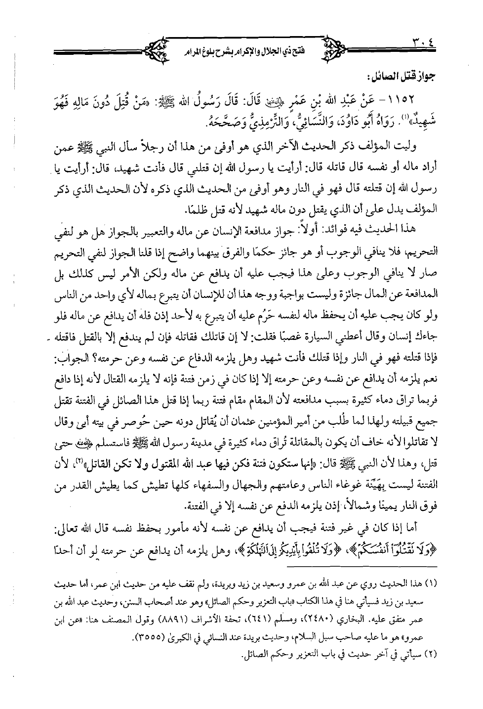 1152 - عن عبد الله بن عمر رضى الله عنهما قال: قال رسول الله صلى الله عليه وسلم: "من قُتل دون ماله فهو شهيدٌ". رواه أبو داود، والنَّسائُّي، والترمذي وصحَّحه.
