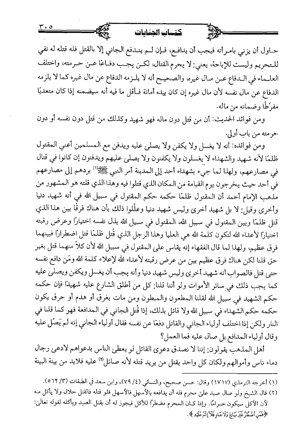 ومن فوائده: أنه لا يغسل ولا يكفن ولا يصلى عليه ويدفن مع المسلمين أغني المقتول ظلمًا لأنه شهيد والشهداء لا يغسلون ولا يكفنون ولا يصلى عليهم ويدفنون إن كانوا في قتال في مصارعهم، ولهذا لما جيء بشهداء أحد إلى المدينة أمر النبي صلى الله عليه وسلم بردهم إلى مصارعهم فيس أحد حيث يخرجون يوم القيامة من المكان الذي قتلوا فيه وهذا الذي قتله هو المشهور من مذهب الإمام أحمد أن المقتول ظلمًا حكمه حكم المقتول في سبيل الله في أنه شهيد دنيا وأخرى وقيل: لا بل شهيد أخرى وليس شهيد دنيا وعلَّلوا ذلك بان هناك فرقّا بين هذا الذي قتل ظلمًا وبين المقتول في سبيل الله، المقتول في سبيل الله بذل نفسه اختيارًا وعرض رقبته اختيارً لأعداء الله لتكون كلمة الله هي العليا وهذا الرجل الذي قُتل ظلمًا اضطرارًا فبينهما فرق عظيم، ولهذا لما قال الفقهاء إنه يقاس على المقتول في سبيل الله لأن كلاً منهما قتل بغير حق قلنا لكن هناك فرق عظيم بين من عرض رقبته لأعداء الله لإعلاء كلمة الله ومن دافع نفسه حتى قتل فالصواب أنه شهيد أخرى وليس شهيد دنيا وأنه يجب أن يغسل ويكفن ويصفى عليه كما يجب ذلك في سائر الأموات ولو أننا قلنا: كل من أطلق الشارع عليه شهيدًا فإن حكمه حكم الشهيد في سبيل الله لقلنا المطعون والمبطون ومن مات بغرق أو هدم أو حرق يكون حكمه حكم الشهداء في سبيل الله ولا قاتل بذلك، إذا قُتل الجاني في المدافعة فهو كما قلنا في النار ولكن إذا اختلف أولياء الجاني والقاتل دفعًا عن نفسه فقال أولياء الجاني إنه لم يصل عليه وقال أولياء المدافع بل صال عليه فما العمل؟