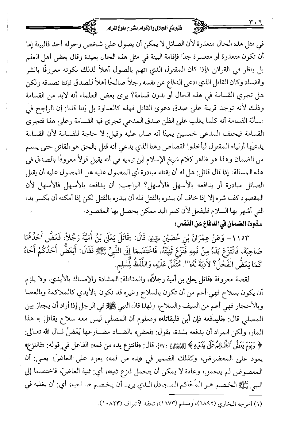 1153 - وعن عمران بن حصين رضى الله عنهما قال: "قاتل يعلى بن أمية رجلاً، فعضَّ أحدهما صاحبه، فانتزع يده من فمه فنزع ثنيَّته، فاختصما إلى النَّبيِّ صلى الله عليه وسلم فقال: أيعضُّ أحدكم أخاه كما يعضُّ الفحل؟ لا دية له". متفقٌ عليه، واللَّفظ لمسلم.